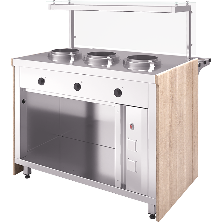 Мармит для первых блюд с электросупницей предназначен для поддержания в горячем состоянии первых блюд и раздачи их потребителю. Вместимость супницы — 10 л. Диаметр ободка — 280 мм. Терморегулятор от 0 до 95°С. Теплоноситель — паровая рубашка. Мармит имеет светодиодную подсветку в нише фасадной части и подсветку рабочей зоны.