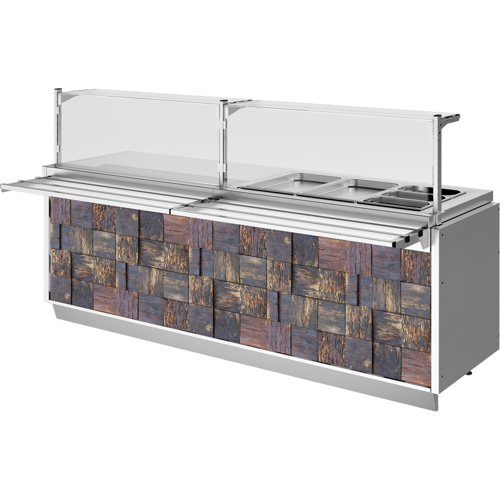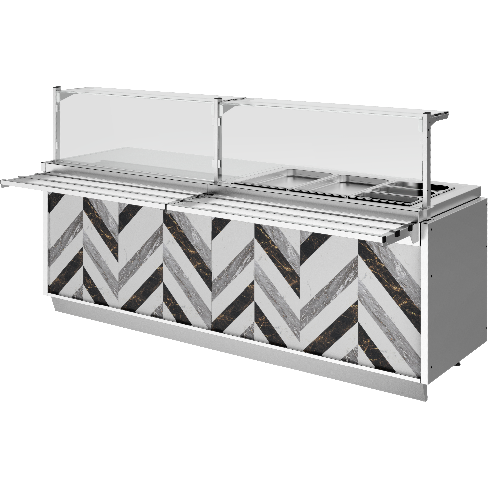 Мармит для первых блюд предназначен для поддержания в горячем состоянии ёмкостей с первыми блюдами и раздачи их потребителю. Тип электронагревательного устройства — трубчатый электронагреватель (ТЭН), материал конфорки — чугун, диаметр 22,5 мм, мощность 2 кВт. Мармит имеет светодиодную подсветку в нише фасадной части и подсветку рабочей зоны. Материал фасадных панелей — керамогранит (доп. опция).