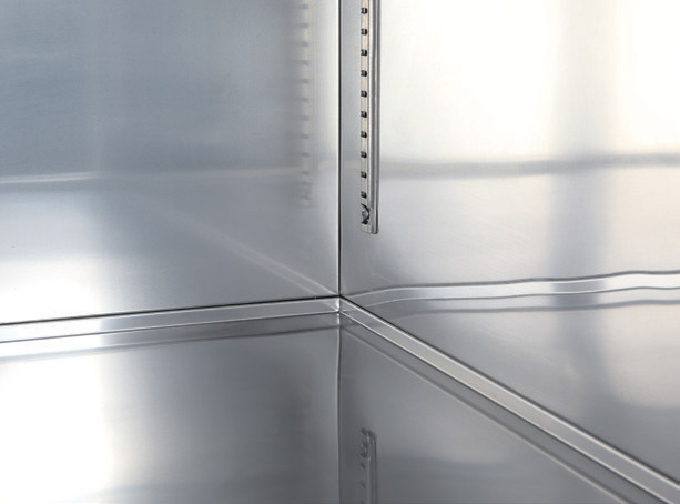 Корпус изготовлен из нержавеющей стали (гальванизированная сталь на оборотной стороне и внизу), острые углы оборудования сглажены (чтобы уменьшить риск получения травм). Пол выполнен из нержавеющей стали с алюминиевыми вставками по бокам и сзади. Это гарантия долгого срока службы и максимальной сохранности продуктов.