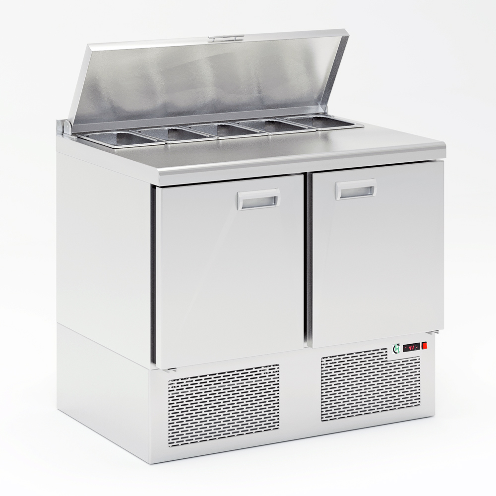 Столешница сконструирована специально для удобного приготовления салатов и холодных закусок. Предусмотрено размещение 5 единиц гастроемкости размера GN 1/6.
