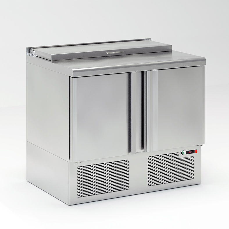Саладетта LARK SLE2-11GN производства Хотколд состоит из среднетемпературной камеры с двумя распашными дверцами и широкой столешницы, оснащенной специальным углублением для размещения гастроемкостей.