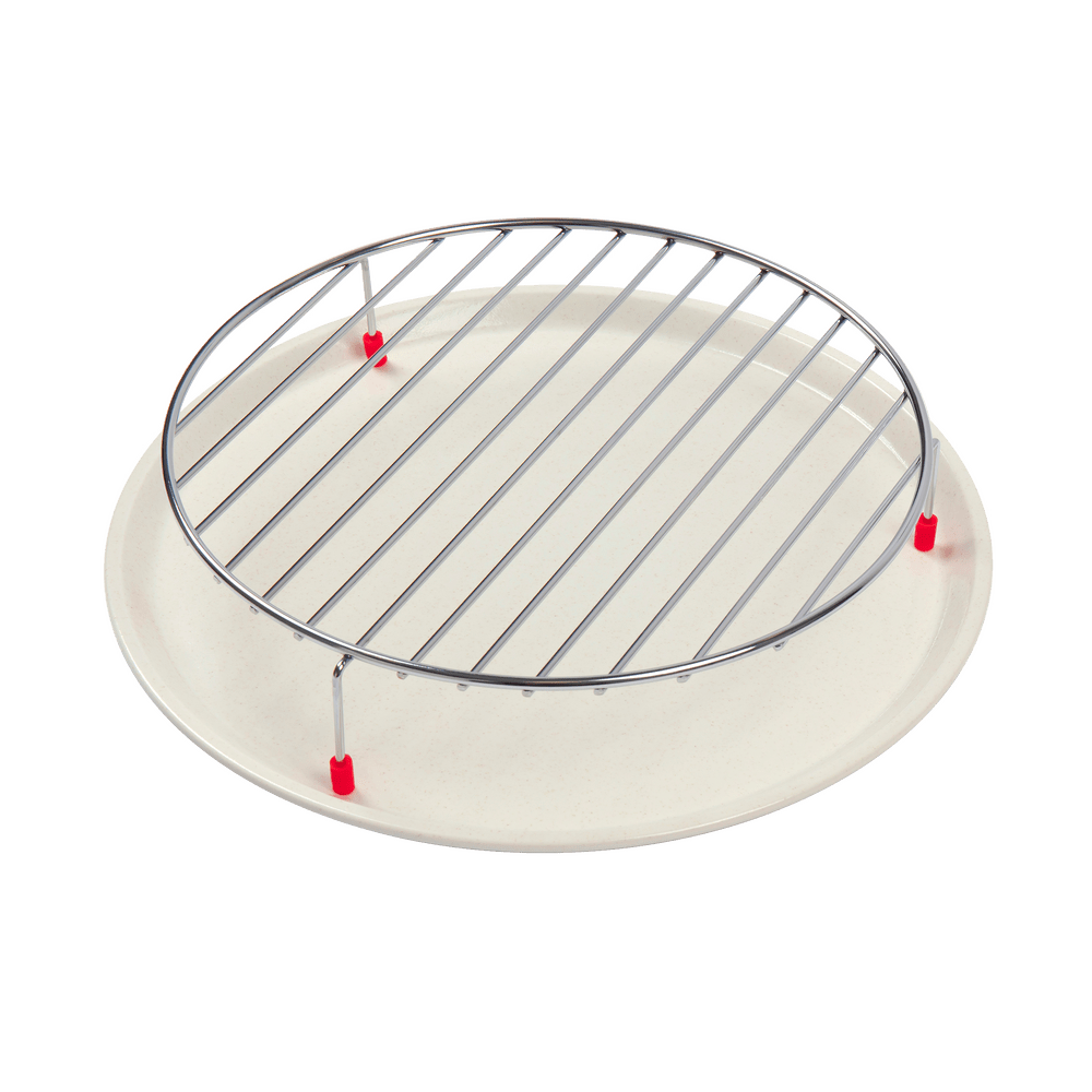 В комплекте: вращающееся кольцо, круглая подставка для гриля, квадратная решетка для гриля, универсальный противень, круглый керамический поддон, круглый эмалированный поддон.
