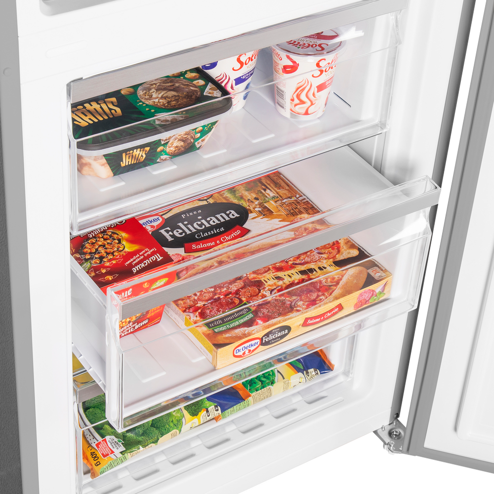 - Полки из прозрачного закалённого стекла легко переставляются и не мешают равномерному освещению внутри холодильника