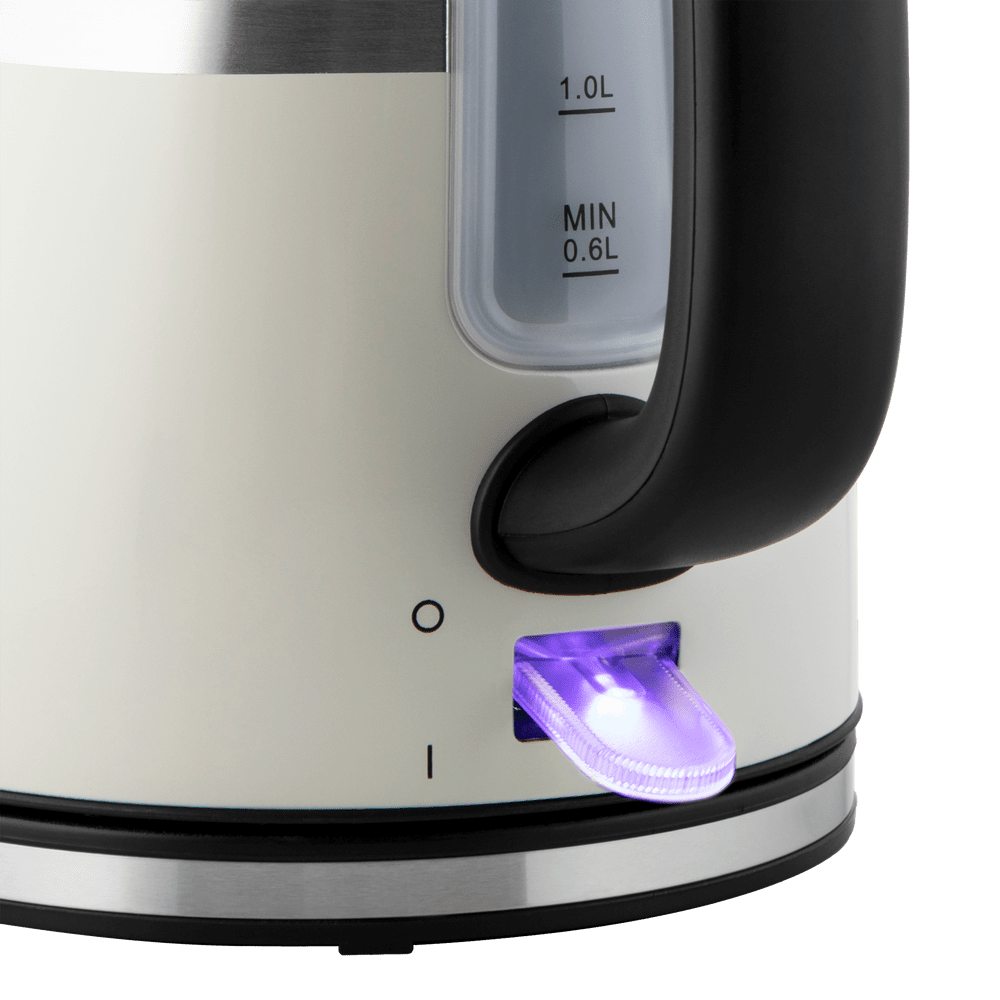 На ручке предусмотрена хромированная кнопка автоматического открывания. Окошко с индикатором уровня воды находится непосредственно на корпусе чайника. Кнопка включения/выключения с голубой подсветкой располагается под ручкой В носике крепится съёмный фильтр, который легко достаётся и моется.