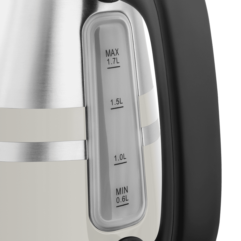 Корпус, сделанный из нержавеющей стали, имеет ассиметричную вытянутую горловину. Бежевый принт чайника удачно сочетается с чёрной термостойкой ручкой и крышкой, которые не нагреваются от стального корпуса.