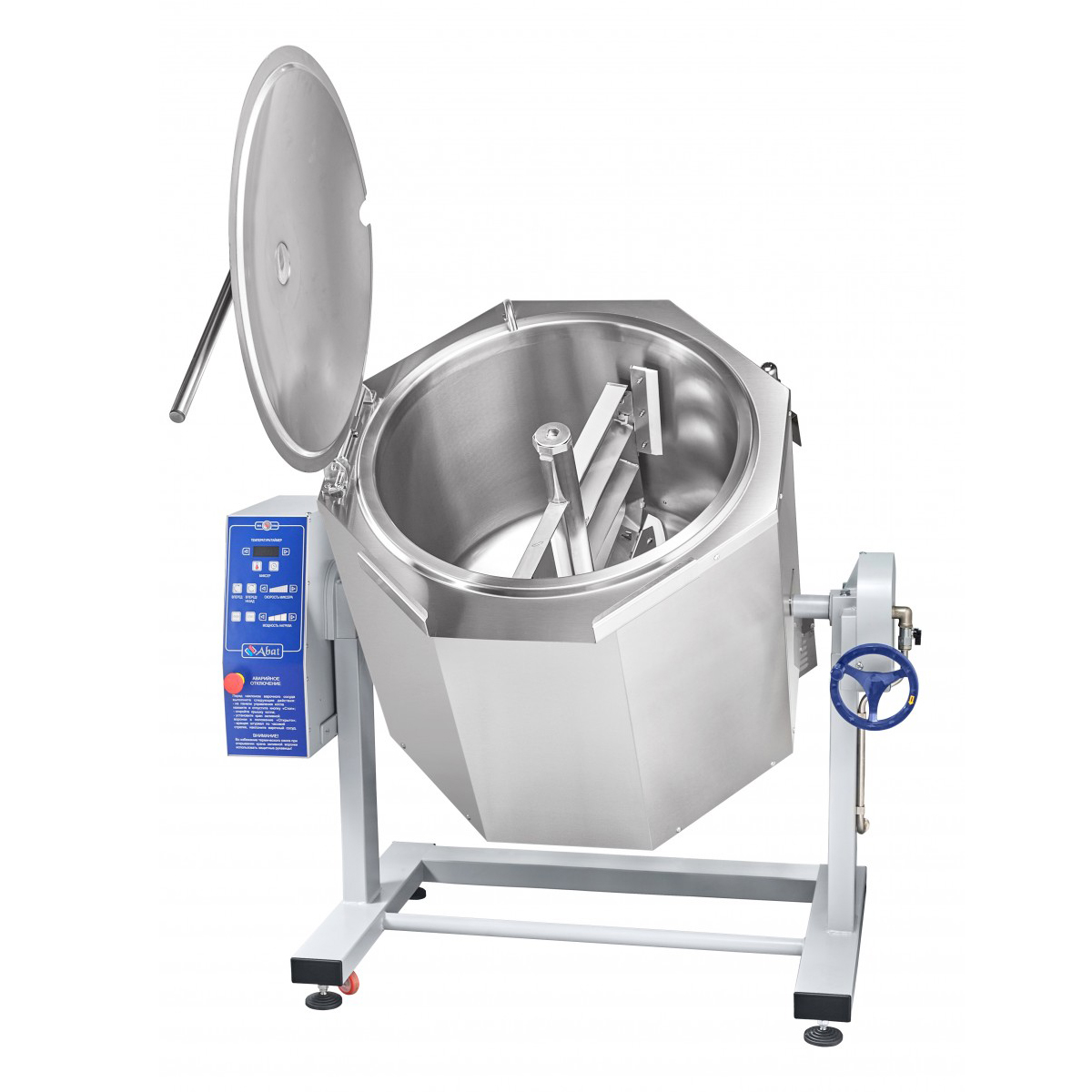 Котёл пищеварочный электрический с функциями перемешивания и ручного опрокидывания КПЭМ-100-ОМР-В на подставке, оснащённой передвижными колёсами и регулируемыми опорами. Оснащён многофункциональным миксером и предназначен для приготовления бульонов, первых, вторых и третьих блюд. Используется на предприятиях общественного питания самостоятельно или в составе технологических линий.