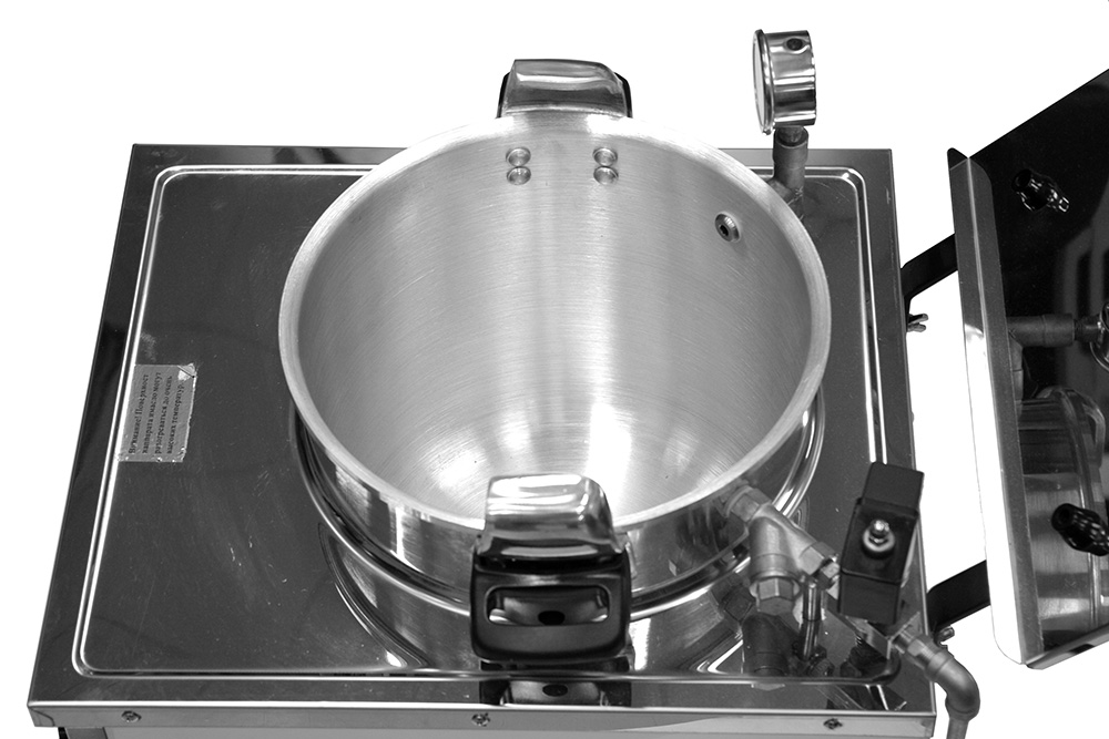 Фритюрница электрическая настольная для жарки под давлением Kocateq PFE16. Минимальный объем масла 8 л, максимальный объем 10 л. Корпус из нержавеющей стали. Герметичная крышка фиксируется с помощью винтовой ручки.