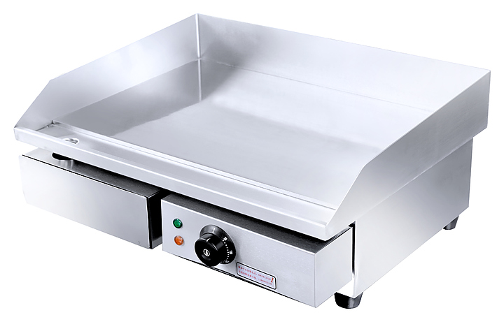 Оборудование оснащено гладкой жаропрочной поверхностью, которая обеспечивает равномерный нагрев и предотвращает пригорание продуктов. Встроенный термостат позволяет точно регулировать температуру в диапазоне от 50 до 300°C.