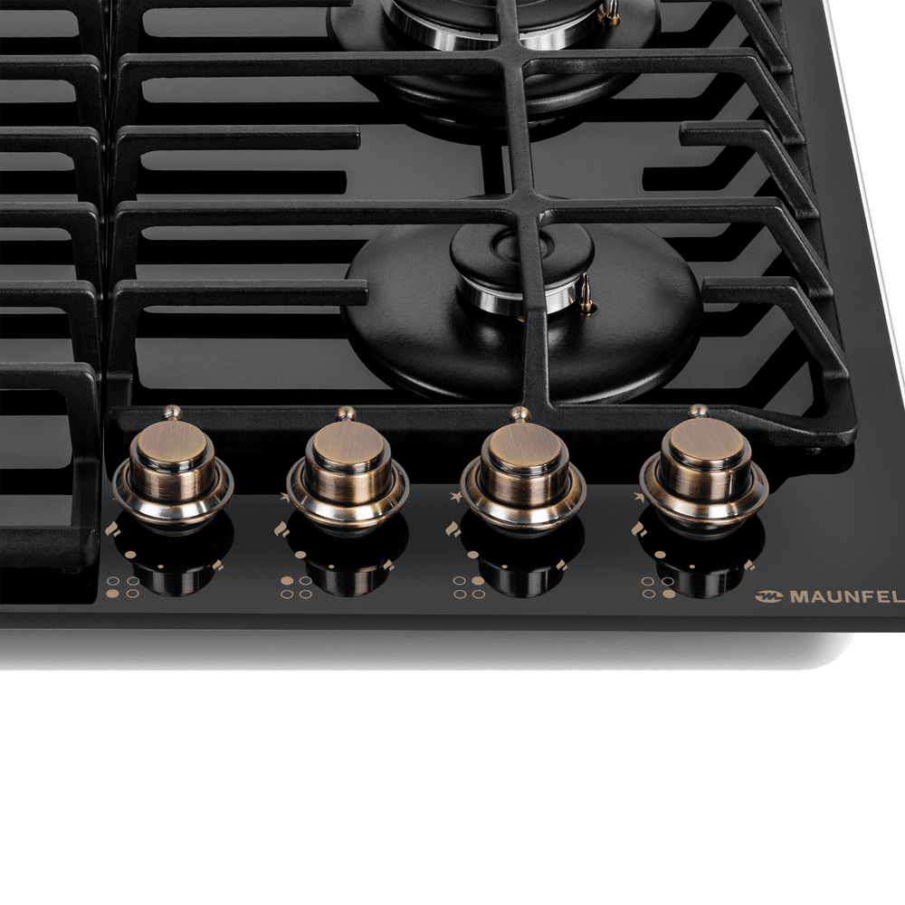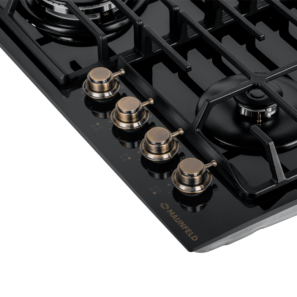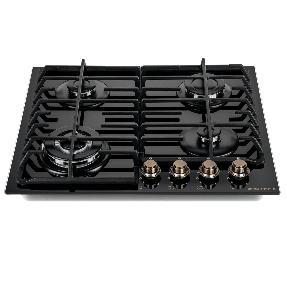 Встраиваемая четырехконфорочная газовая варочная панель MAUNFELD EGHG.64.63CB.R/G выполнена из закаленного стекла черного цвета с чугунной решеткой. Чугунная решетка имеет крестообразные соединения над конфорками, что позволяет готовить в посуде разного диаметра, не используя специальные подставки. Варочная панель с механическим управлением с помощью полнотелых цельнометаллических ручек управления.