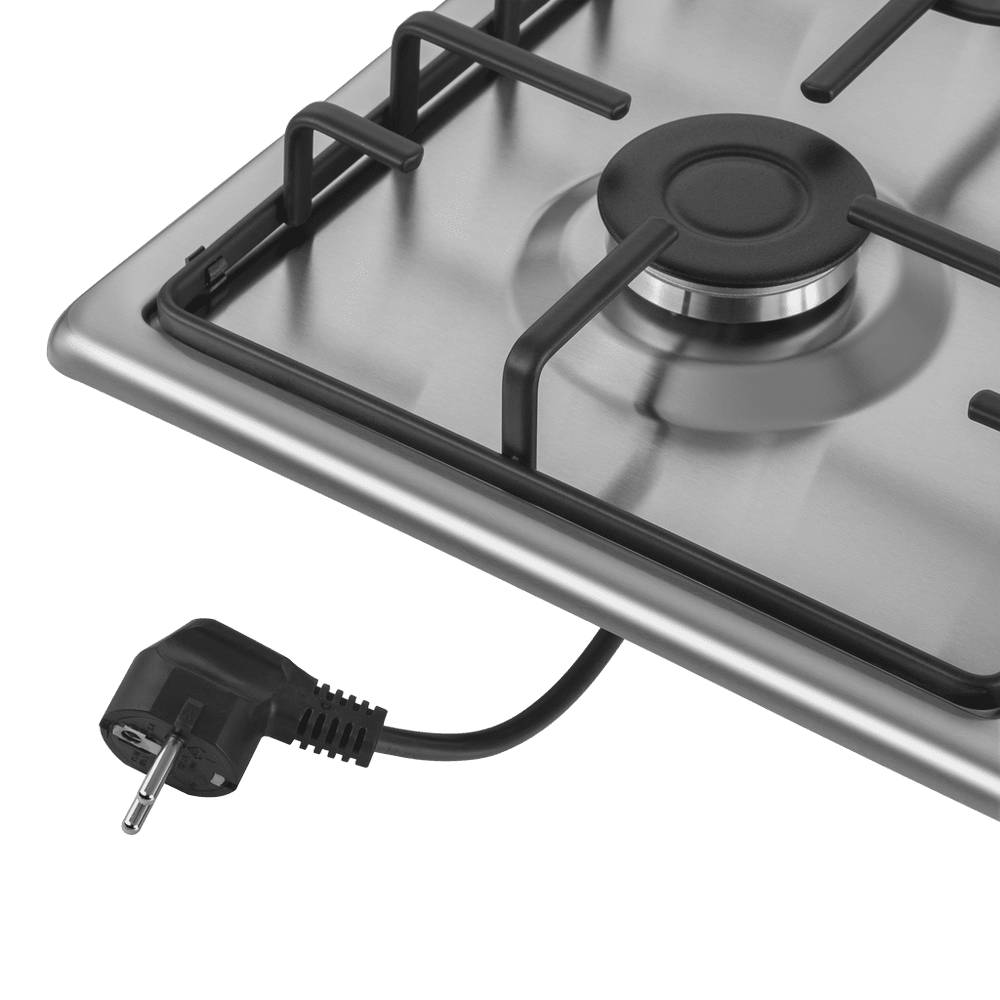 Варочная панель оснащена системой электроподжига. Также в данной модели присутствуют ножки-опоры, что дает возможность использовать панель как встраиваемую, так и настольную.