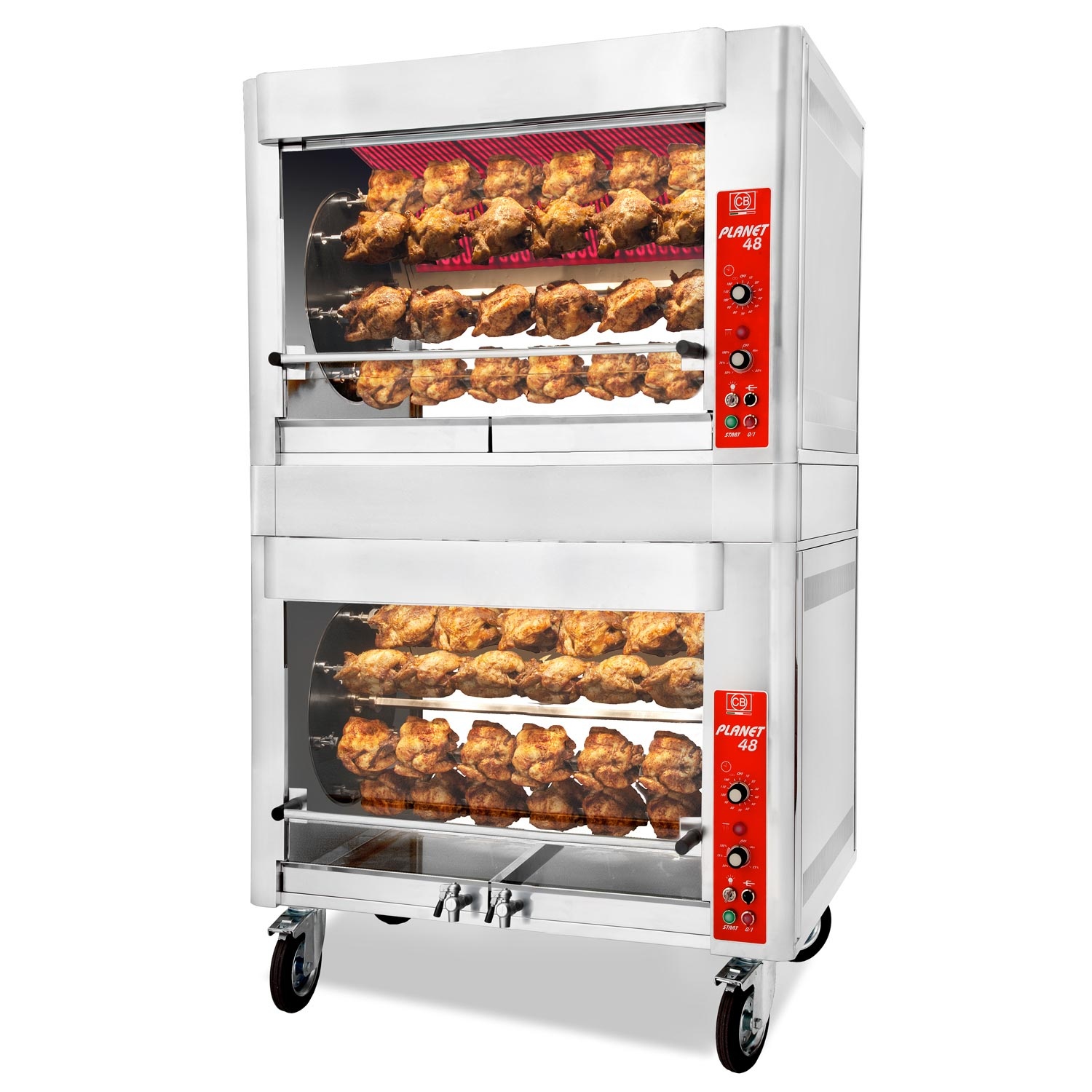 Планетарная электрическая жаровня с инфракрасными нагревательными элементами на 96 кур, в комплекте 16 вертелов с вилками.