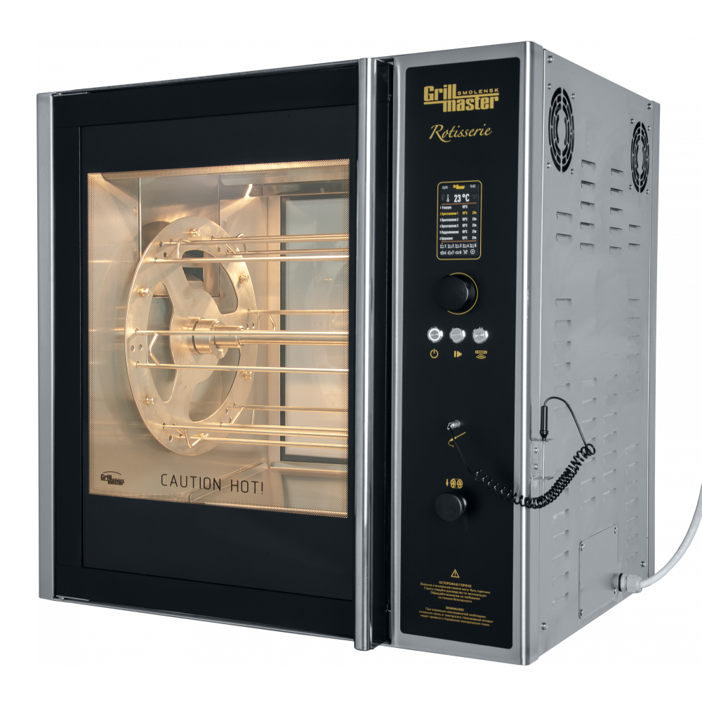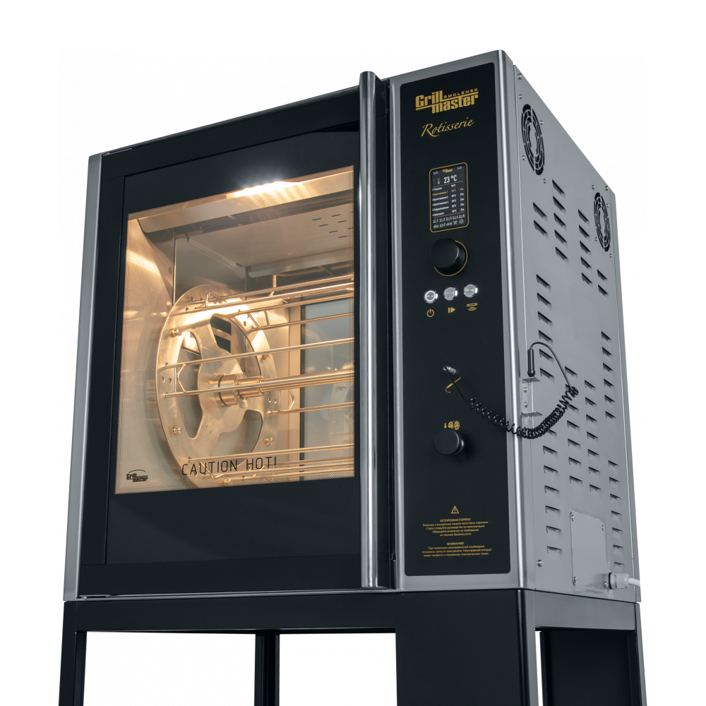 Конвекционный гриль Ф3КЭЛ/1 для кур оснащён электронной панелью управления с джойстиком, 4 режимами работы с 6 шагами приготовления и кварцевой лампой для приготовления идеальной корочки.