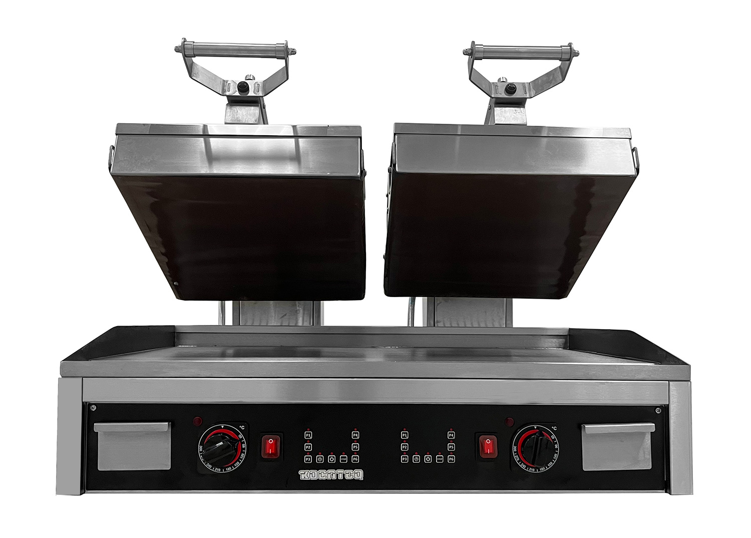 Высокопроизводительная модель класса heavy-duty для предприятий fast-food. Сбалансированные верхние пластины с магнитной фиксацией положения на высоте от 0-15 мм от нижней пластины исключает деформацию и сохраняет сок внутри продукта.