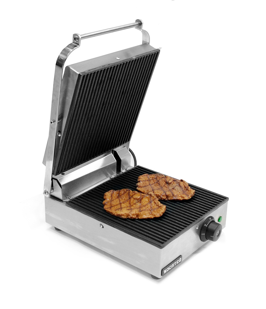 Гриль Kocateq N16 контактный односекционный настольный с двумя пластинами для приготовления шаурмы длиной до 35 см. Верхняя откидная ребристая и нижняя ребристая пластины размером 26*26 см из чугуна. Быстрое и равномерное приготовление за счет нагрева продукта с 2-х сторон.
