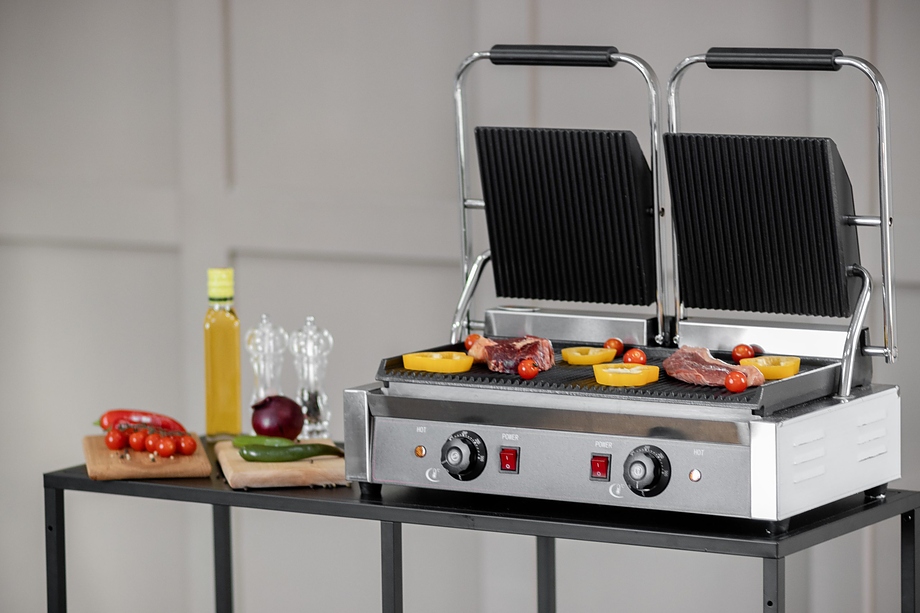 Прижимной гриль Rosso HSG57E PRO - предназначен для жарки, быстрого приготовления и разогрева блюд из мяса, рыбы, птицы и полуфабрикатов на предприятиях общественного питания и торговли. Одновременное воздействие на продукты сразу 2 рабочих поверхностей обеспечивает равномерную прожарку. Модель оснащена индикаторами работы и нагрева и поддоном для сбора жира. Корпус выполнен из нержавеющей стали.