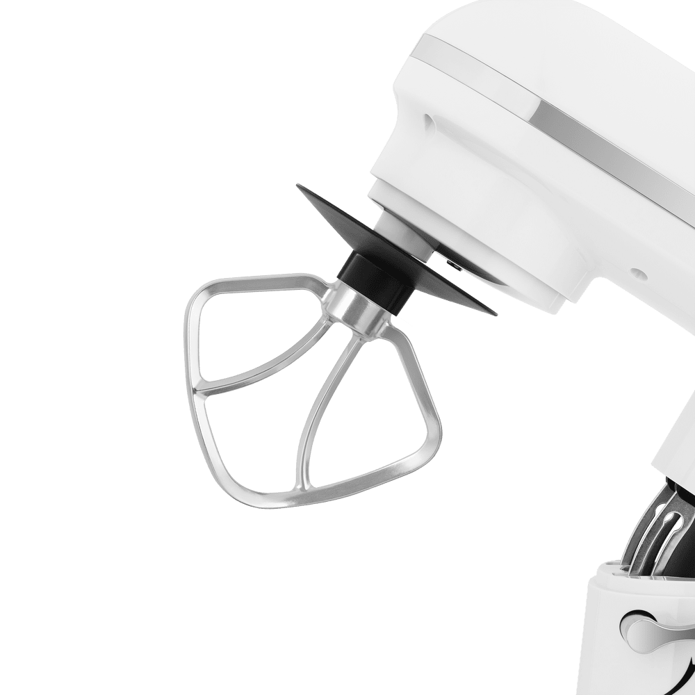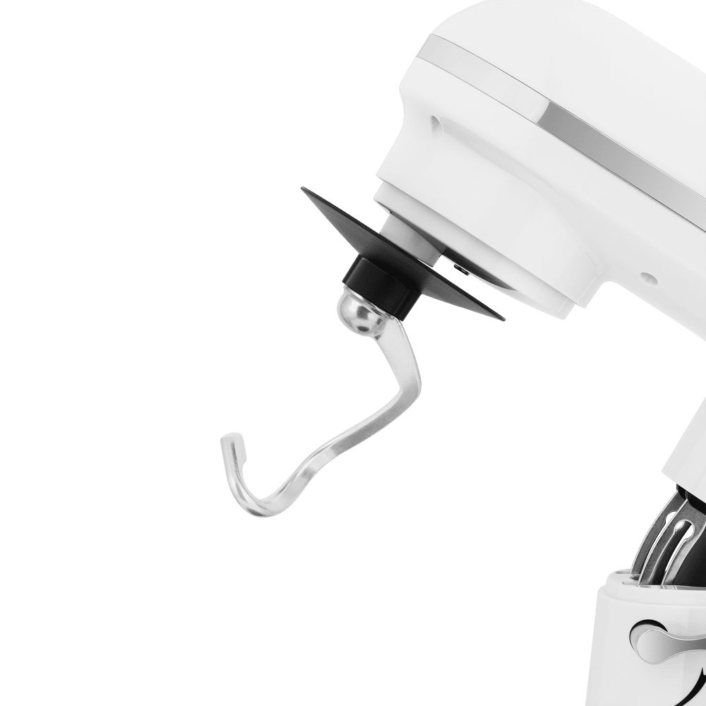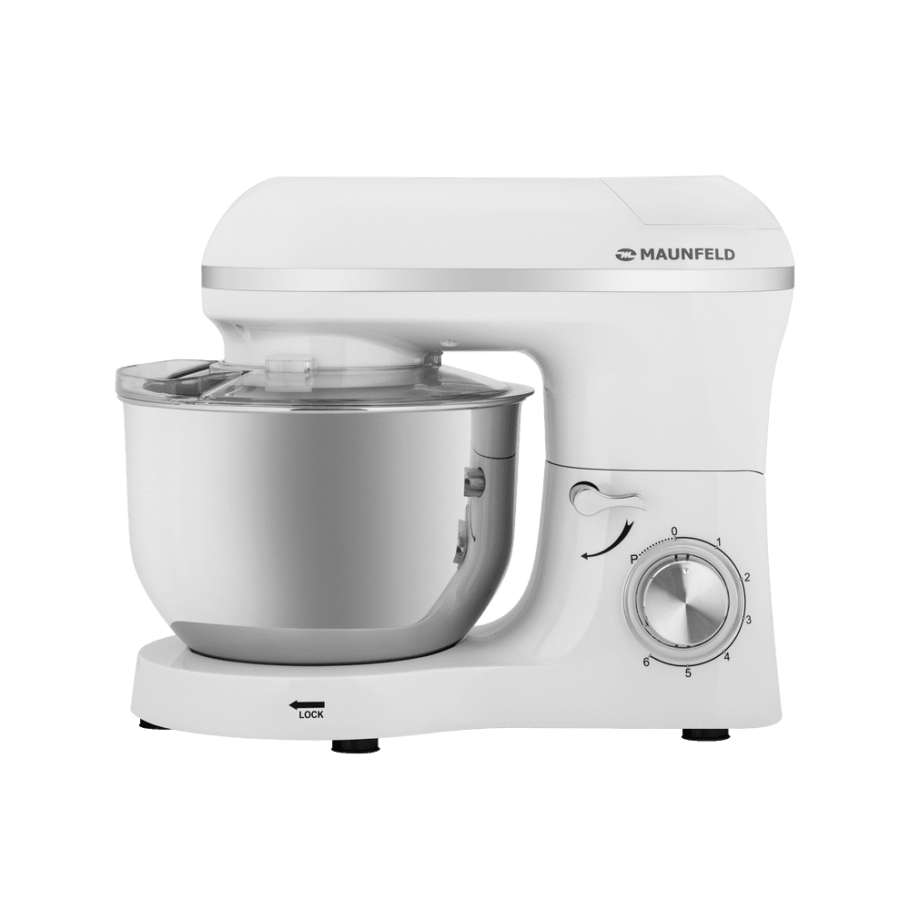 Миксер укомплектован 3 насадками: венчик для взбивания, насадка для перемешивания и крюк для теста. Перемешивание происходит в большой чаше (5,5 л), выполненной из нержавеющей стали и укомплектованной пластиковой защитной крышкой с дозатором.