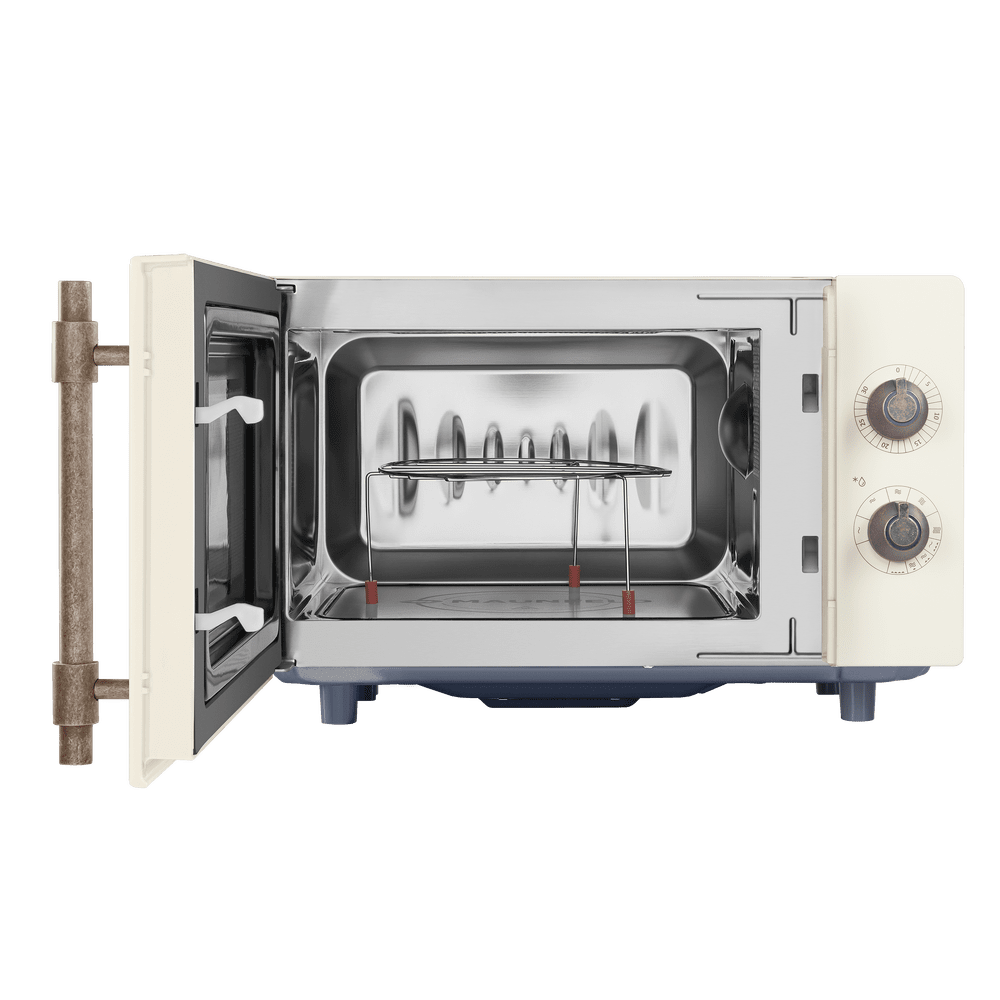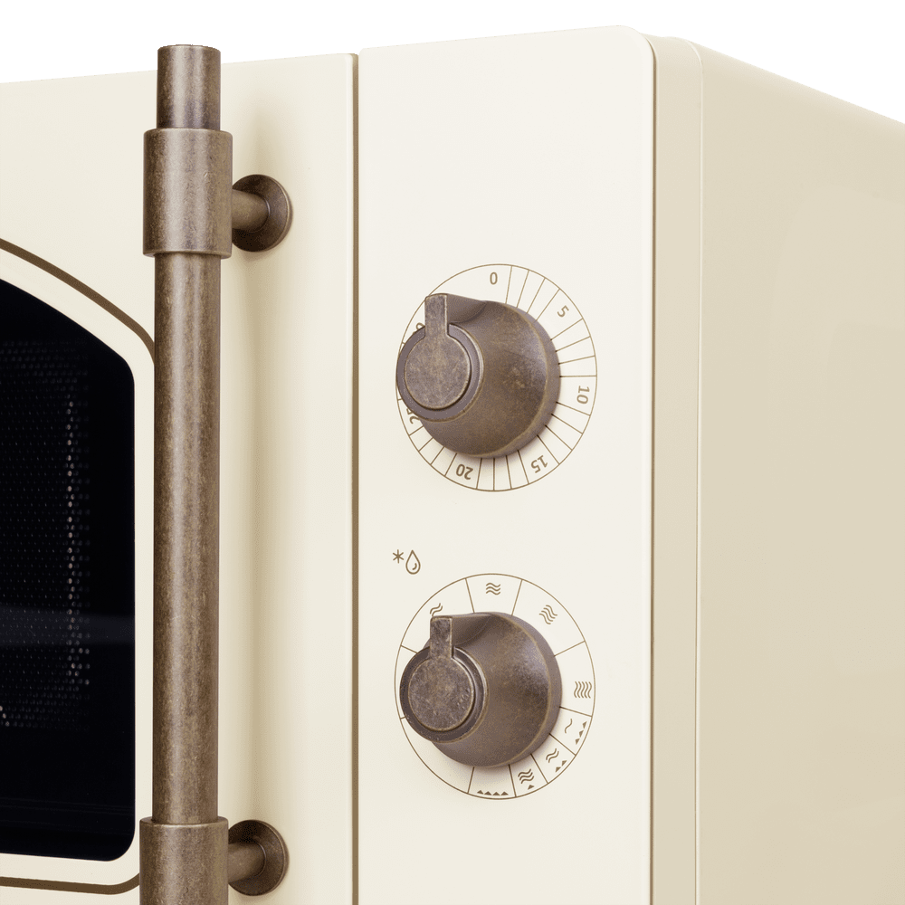 Отдельностоящая микроволновая печь мощностью 1080 Вт выполнена в ретро-стиле, без поворотного стола. Позволяет готовить в 3 режимах: микроволны, гриль и комбо.