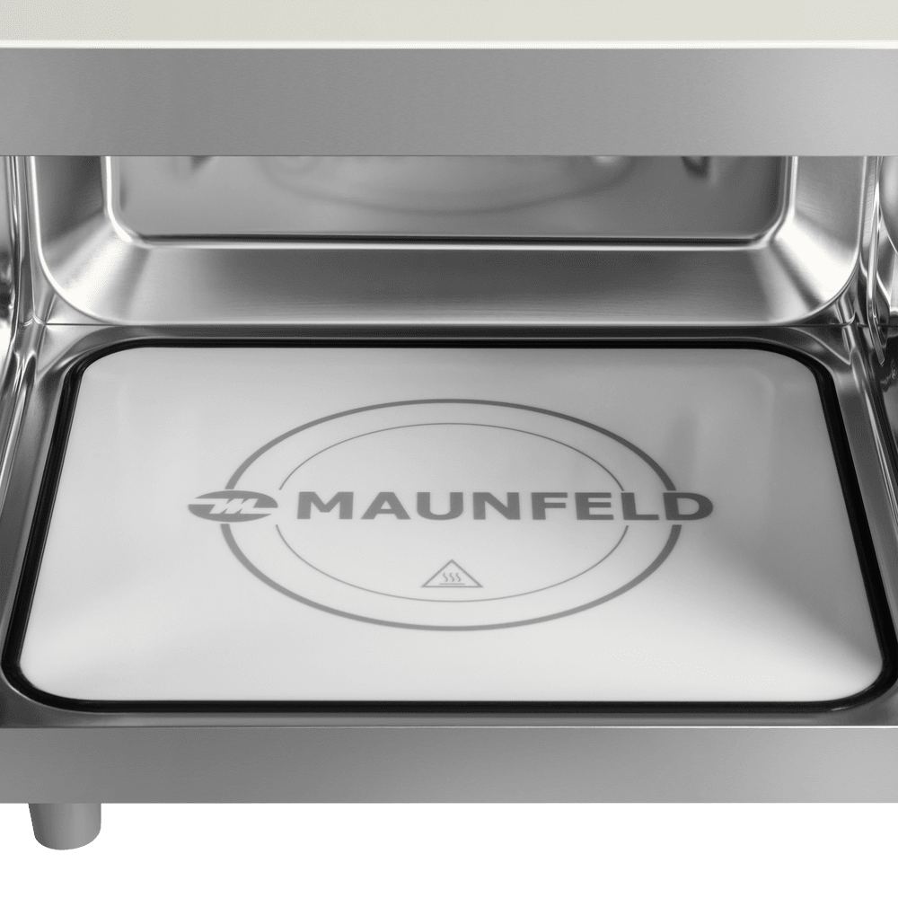 Внутренняя камера, сделанная из высококачественной нержавеющей стали, имеет реальный объём в 20 л благодаря кварцевому грилю и отсутствию поворотного столика. Мощный магнетрон располагается под керамической панелью на дне.