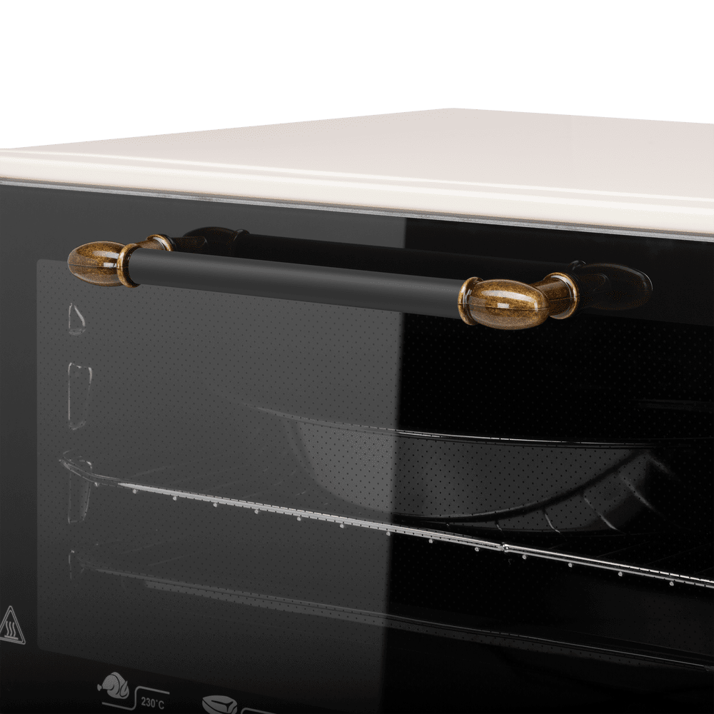 Корпус шириной 60 см из нержавеющей стали имеет улучшенную теплоизоляцию. Матовый бежевый цвет печи сочетается с металлическими вставками на ручках в рустикальном стиле. Внутреннее покрытие камеры выполнено из специальной эмали лёгкой очистки.