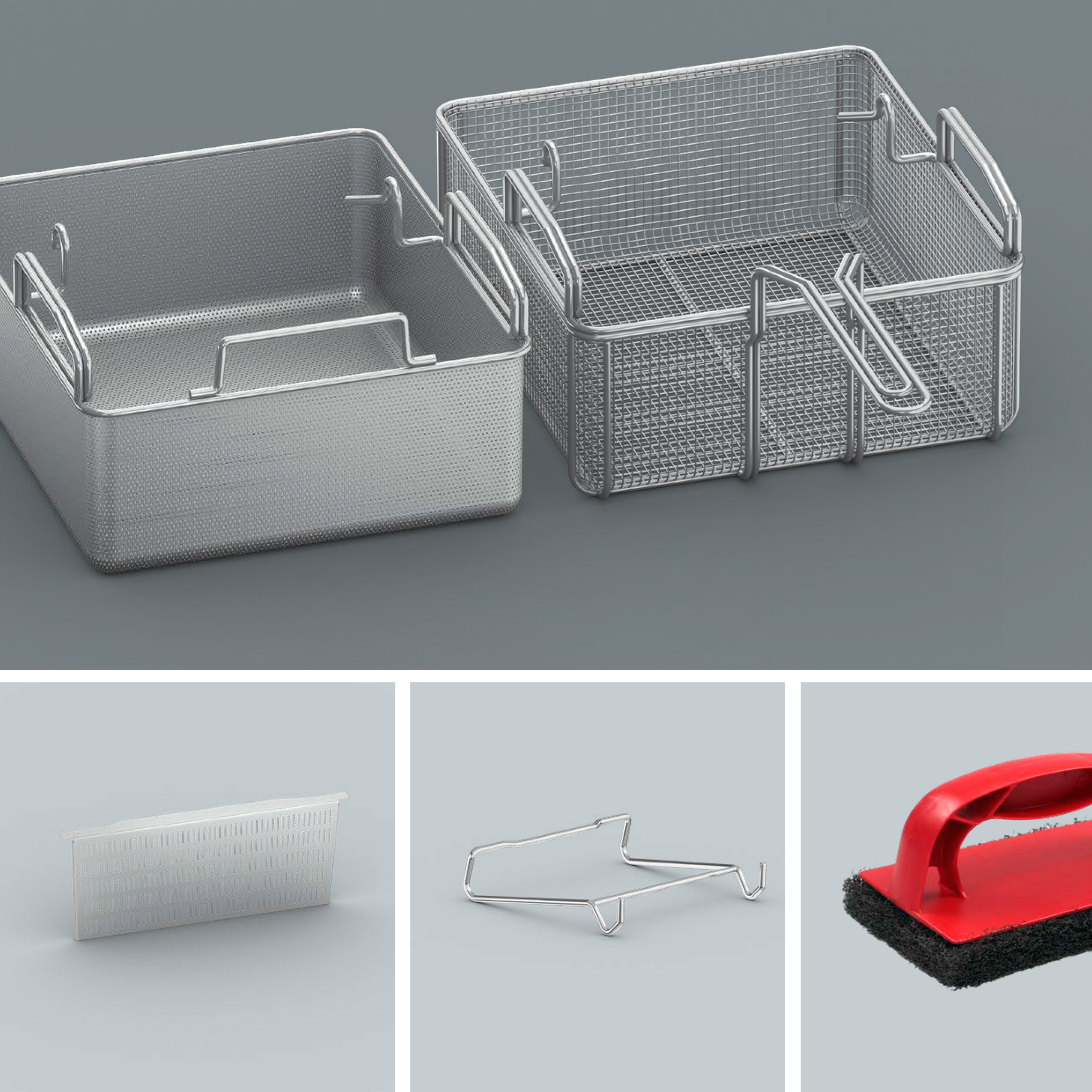 Базовая комплектация iVario Pro 2-S включает в себя кронштейн для автоматического подъёмного устройства, корзину для варки и фритирования, губку для очистки и сито.