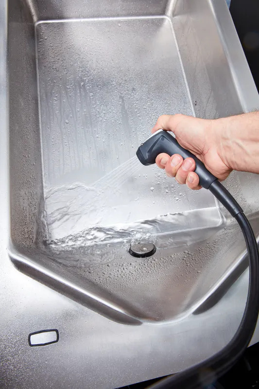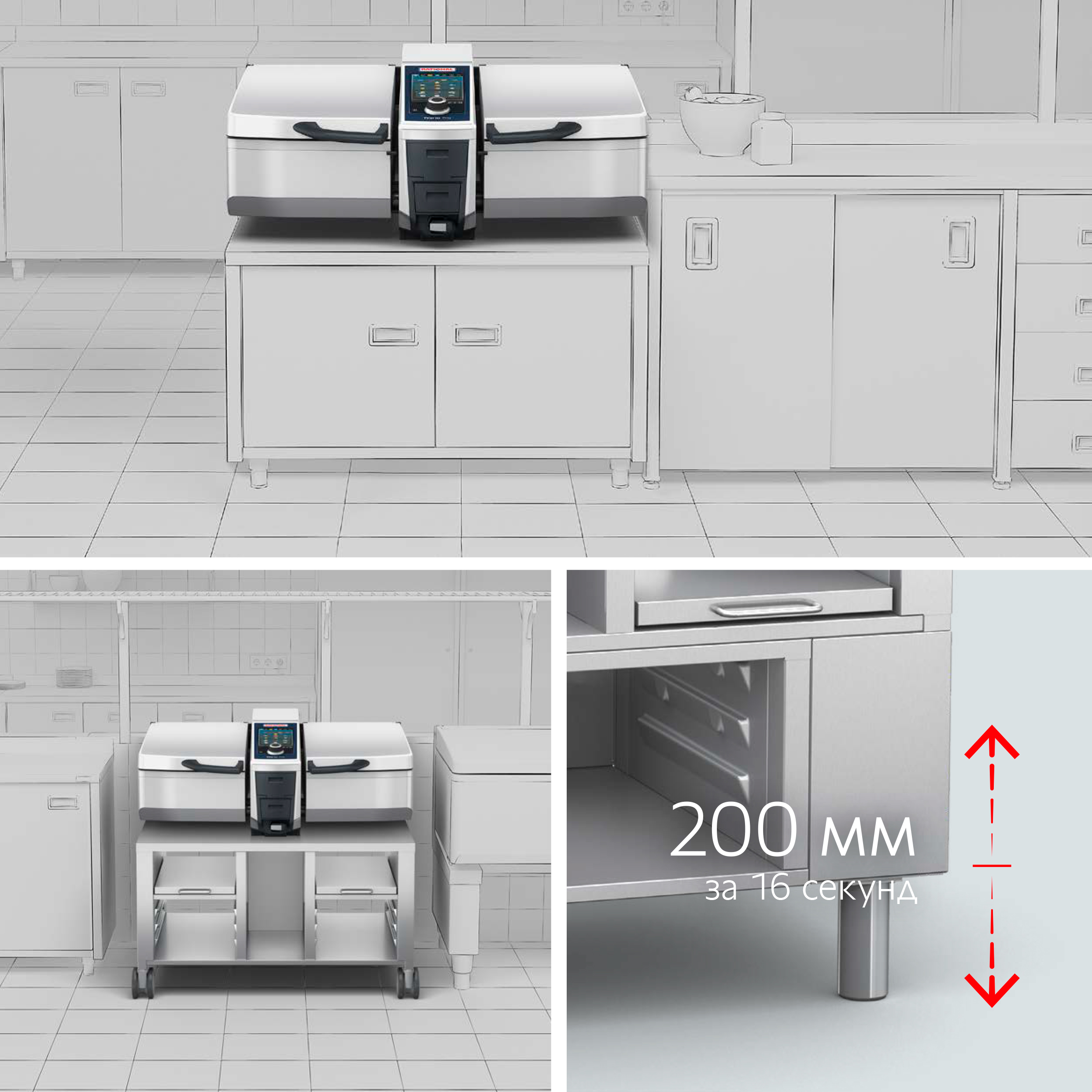 Компактный аппарат экономит пространство и может устанавливаться на столе, на рабочей поверхности, на тепловом острове или даже с интеграцией в него. Встроенный слив воды избавляет от необходимости размещать сток в полу. Соответствует требованиям стандарта IPX5, что позволяет проводить полную очистку кухни.