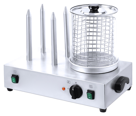 Конструкция аппарата включает паровую камеру цилиндрической формы с прозрачной дверцей для сосисок и платформу с 4-мя штырьками для подогрева булочек. Исполнение – нержавеющая сталь. Может использоваться для приготовления не только хот-догов, но и других блюд на пару.