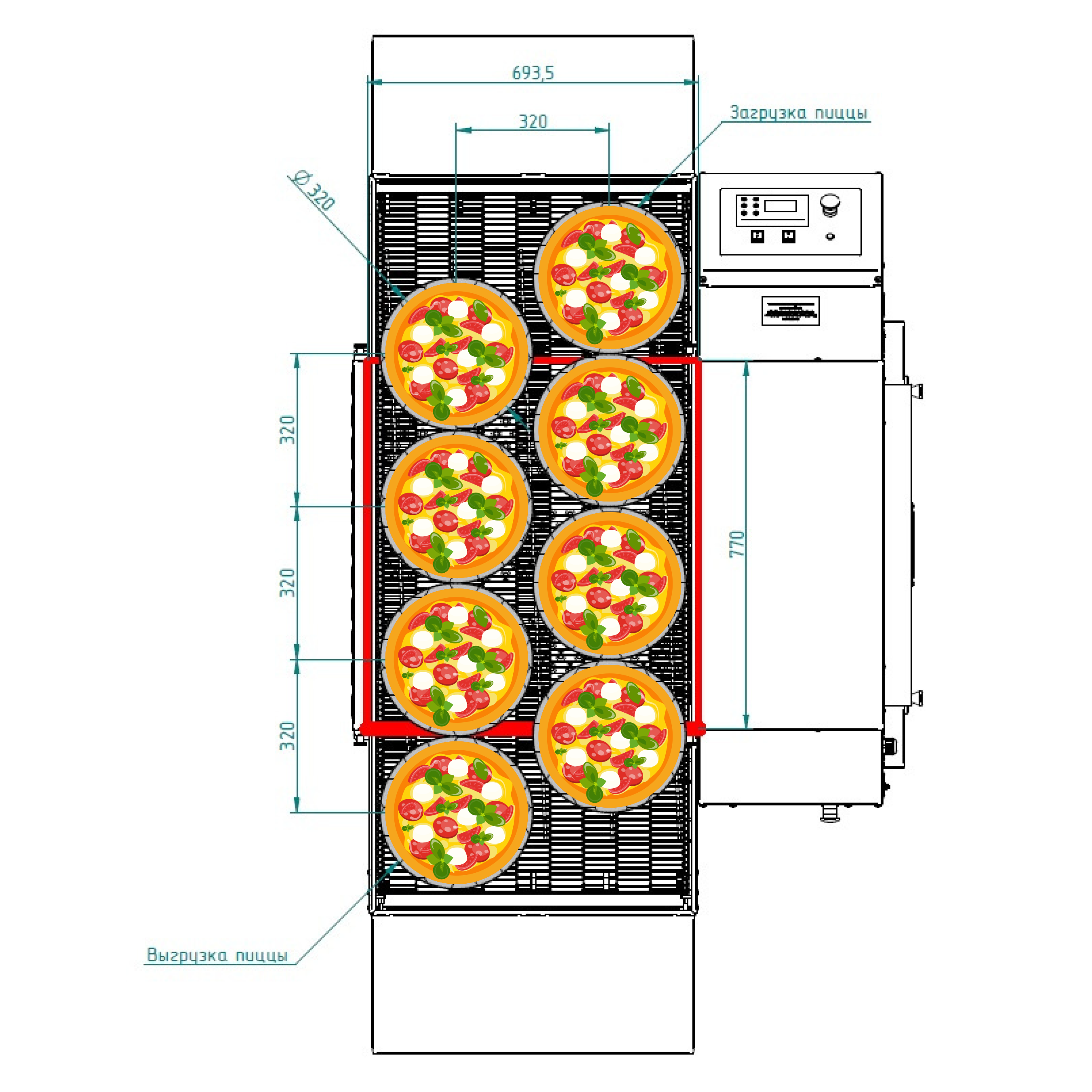 Внутренние размеры камеры и размеры конвейера позволяют последовательно загрузить в конвейерную печь до 8 заготовок пиццы диаметром 30 см.