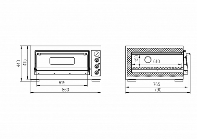 Корпус изготовлен из высококачественной нержавеющей стали. Каменный под и возможность регулировки температуры нижней и верхней поверхностей позволяют максимально равномерно распределить тепло внутри печи и доводить пиццу до полной готовности в течение 3-5 минут.