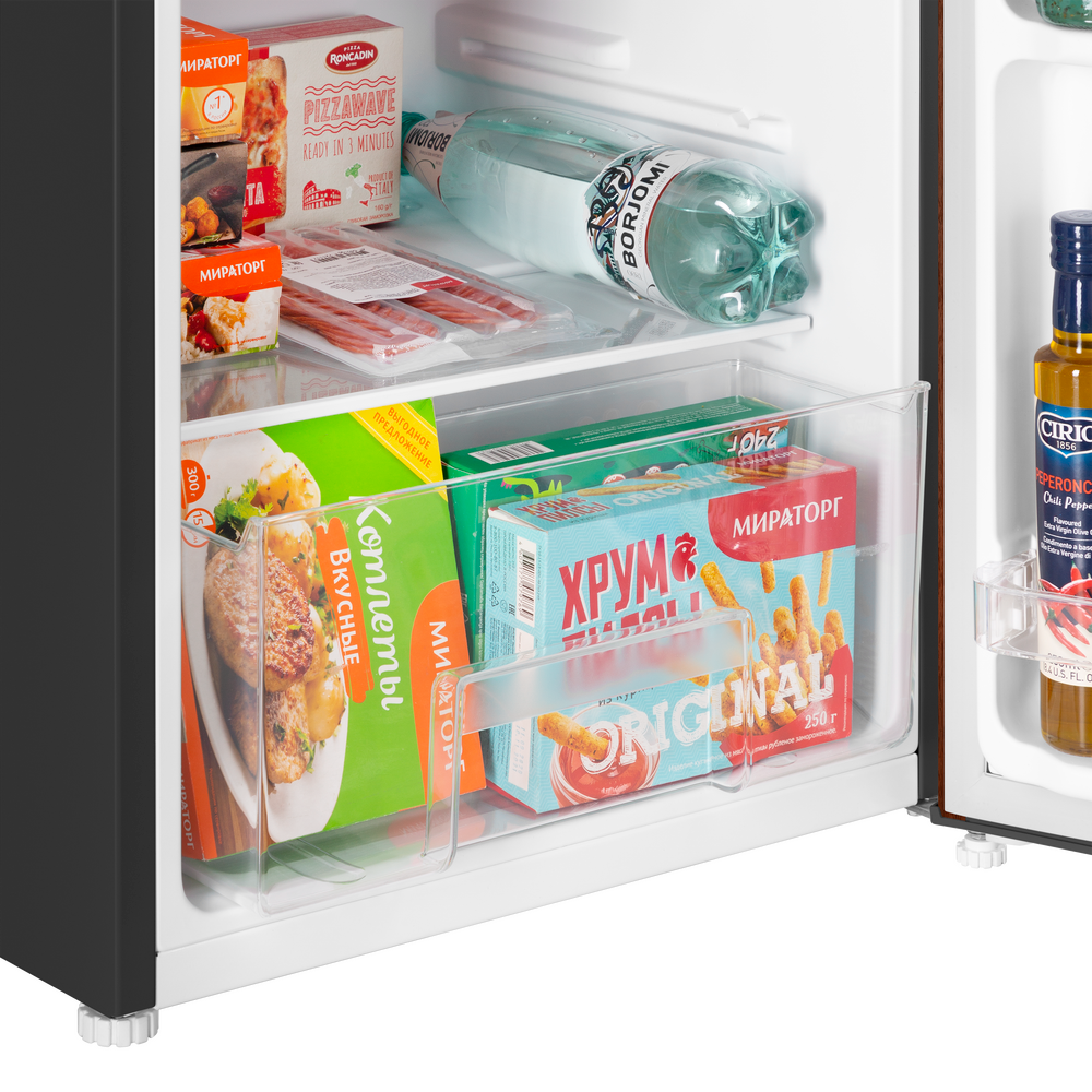 - Полки из прозрачного закалённого стекла легко переставляются и не мешают равномерному освещению внутри холодильника