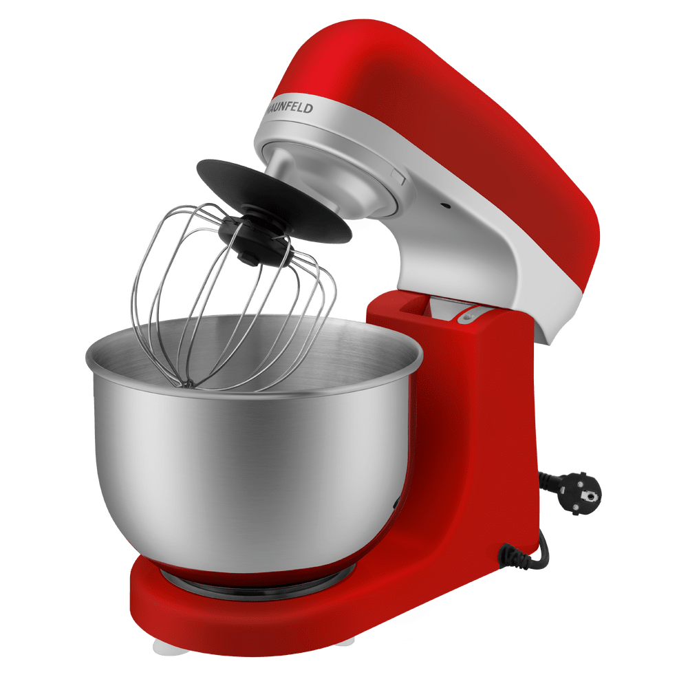 Планетарный миксер MF-422 мощностью 1200 Вт с пятилитровой металлической чашей и тремя насадками.