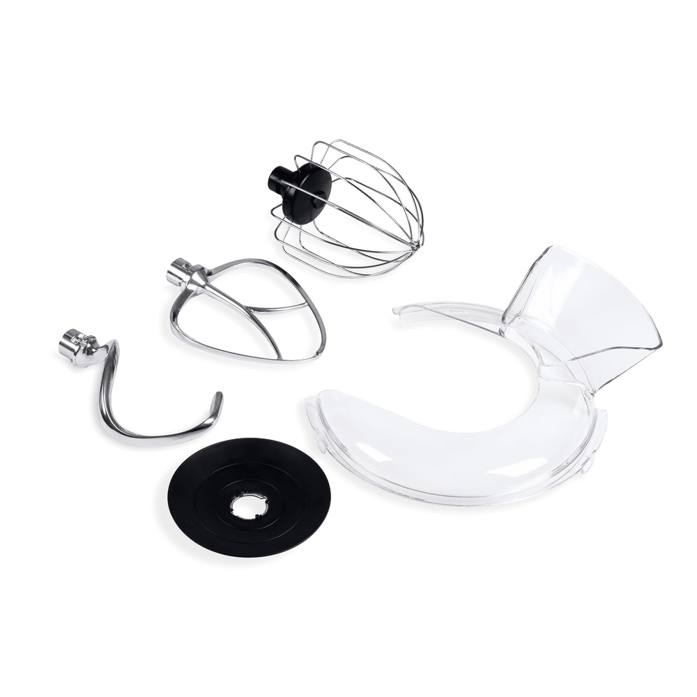 - В комплекте крюк для теста, венчик для взбивания, насадка для перемешивания, крышка на чашу, чаша на 5 л, защитный кожух от брызг