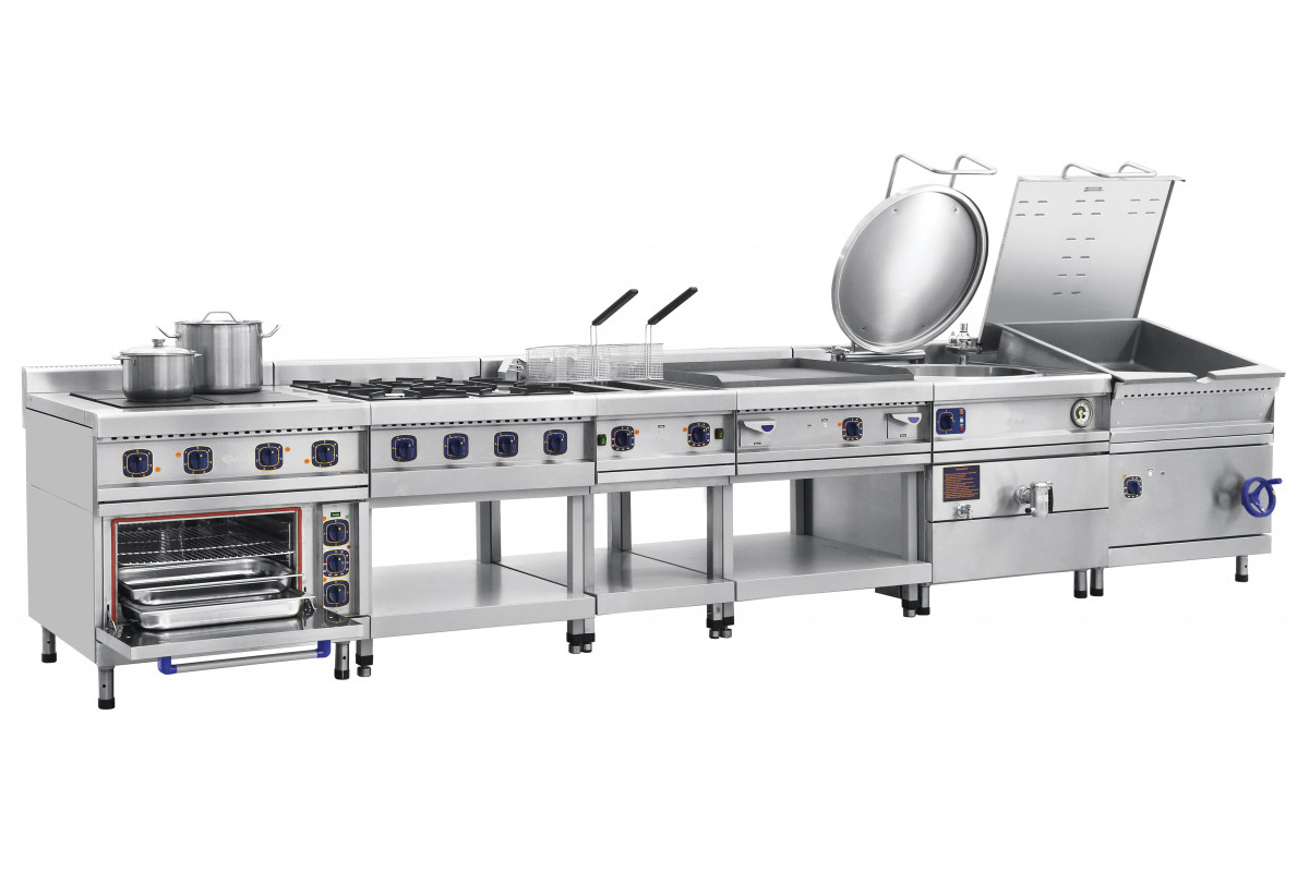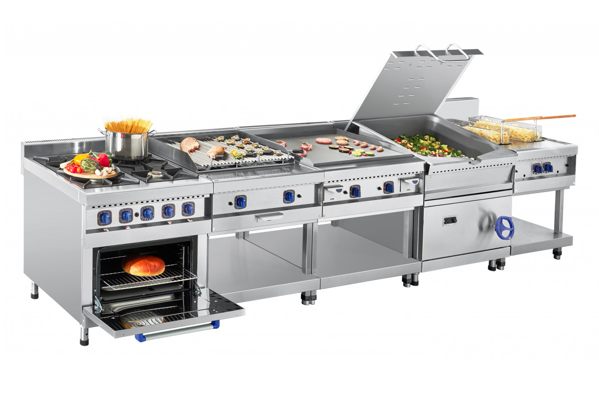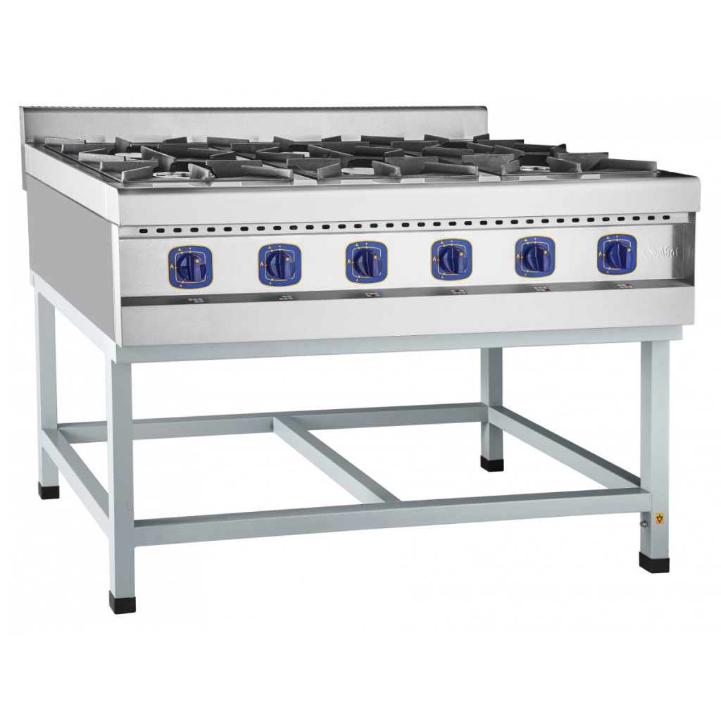 Плита имеет четыре горелки по 5,5 кВт и две мощные горелки "двойная корона" — 7,5 кВт. Снабжена устройством "газ-контроля".