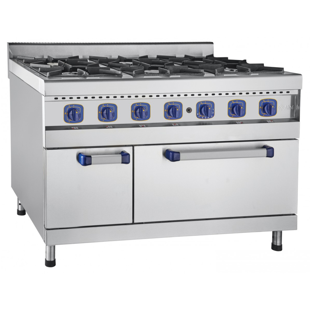 Плита имеет четыре горелки по 5,5 кВт и две мощные горелки "двойная корона" — 7,5 кВт. Снабжена системой пьезоподжига горелки духовки и устройством "газ-контроля".
