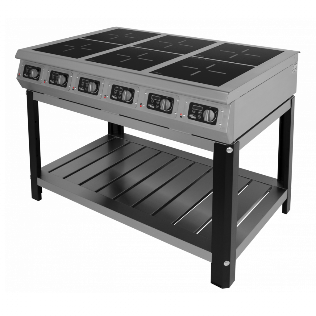 Электрическая индукционная плита Ф6ИП/800 на разборной подставке с шестью конфорками мощностью 3,5 кВт и 10-ю режимами работы. Оснащена сенсорным управлением с механическим переключателем и ЖК-дисплеем.