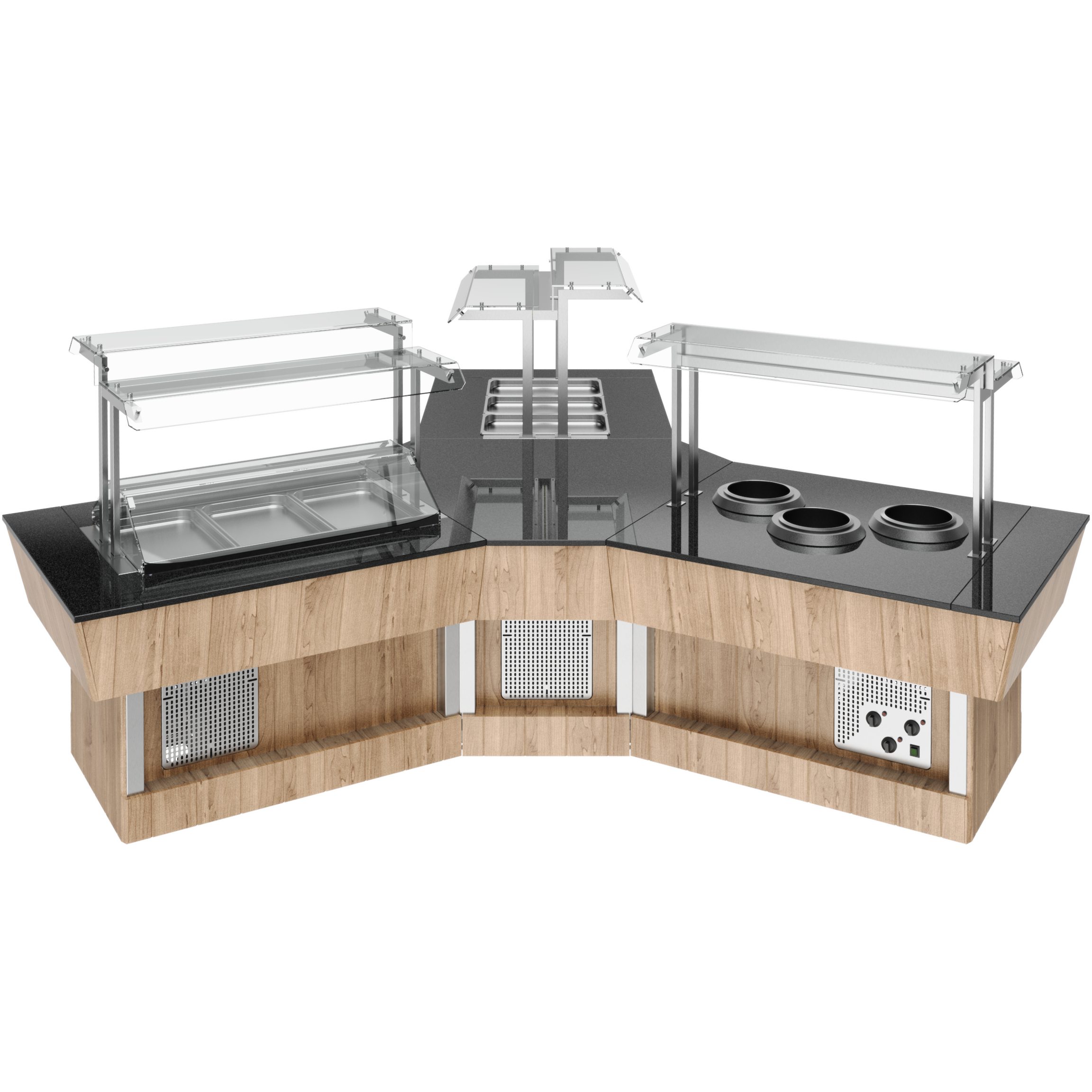 Прилавок нейтральный соединительный на 3 модуля/на 4 модуля. Столешница двух типов: искусственный камень — кварцевый агломерат и металлическая. Толщина столешницы из кварца — 20 мм. Имеет светодиодную подсветку в нише фасадной части.