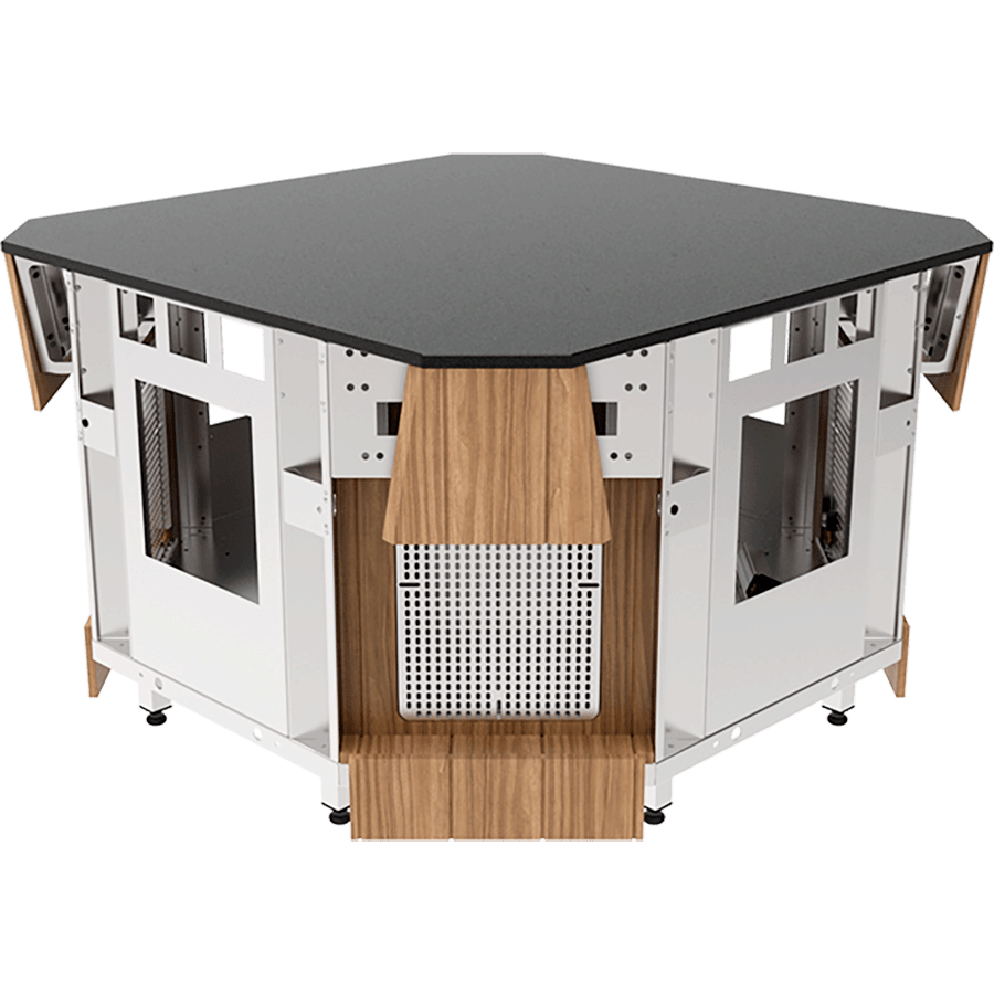 Прилавок нейтральный соединительный на 3 модуля/на 4 модуля. Столешница двух типов: искусственный камень — кварцевый агломерат и металлическая. Толщина столешницы из кварца — 20 мм. Имеет светодиодную подсветку в нише фасадной части.