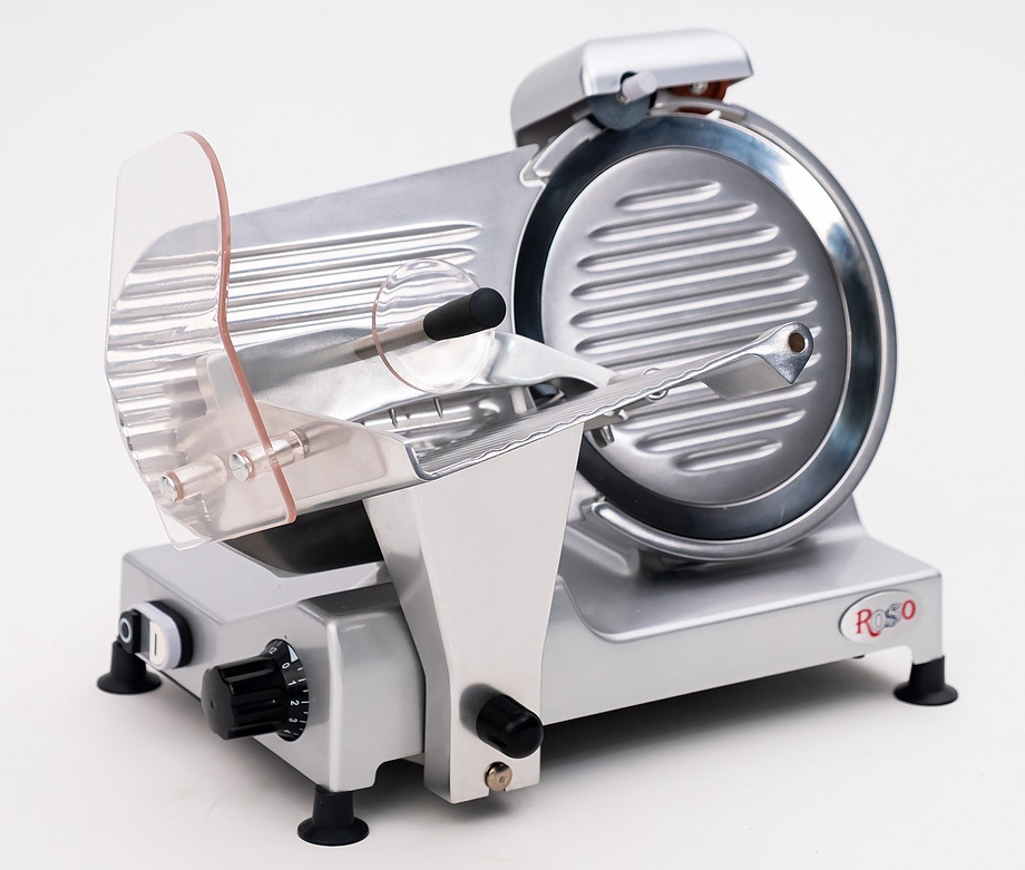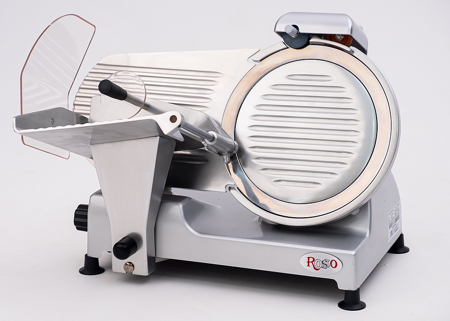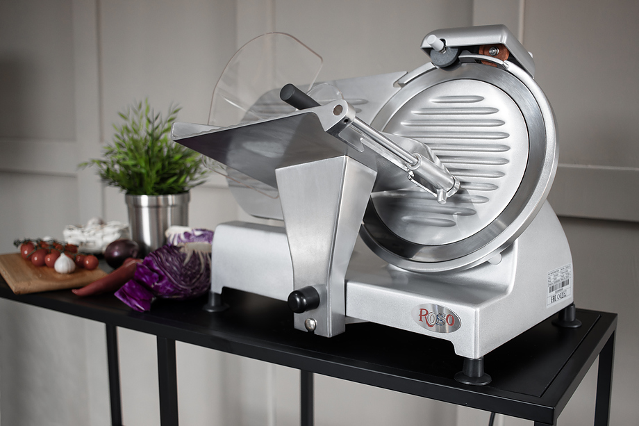 Слайсер Rosso 300ES-12 — предназначен для нарезки продуктов на ломтики заданной толщины на предприятиях общественного питания и торговли. Модель оснащена прижимным устройством, защитным кожухом и литым основанием. Корпус выполнен из нержавеющей стали.