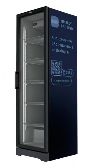 Однодверный холодильный шкаф Briskly Smart 5 Ultra с безрамочной стеклянной распашной дверью с нанесенной шелкографией.