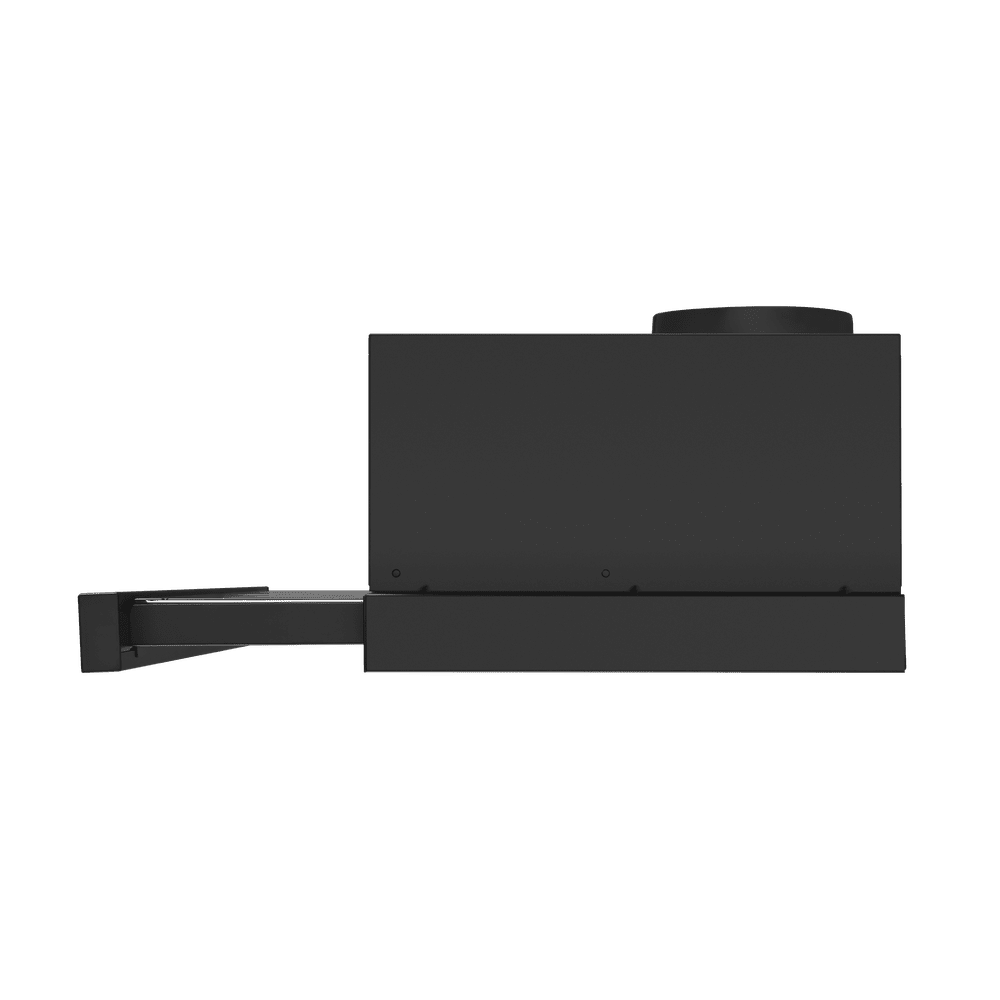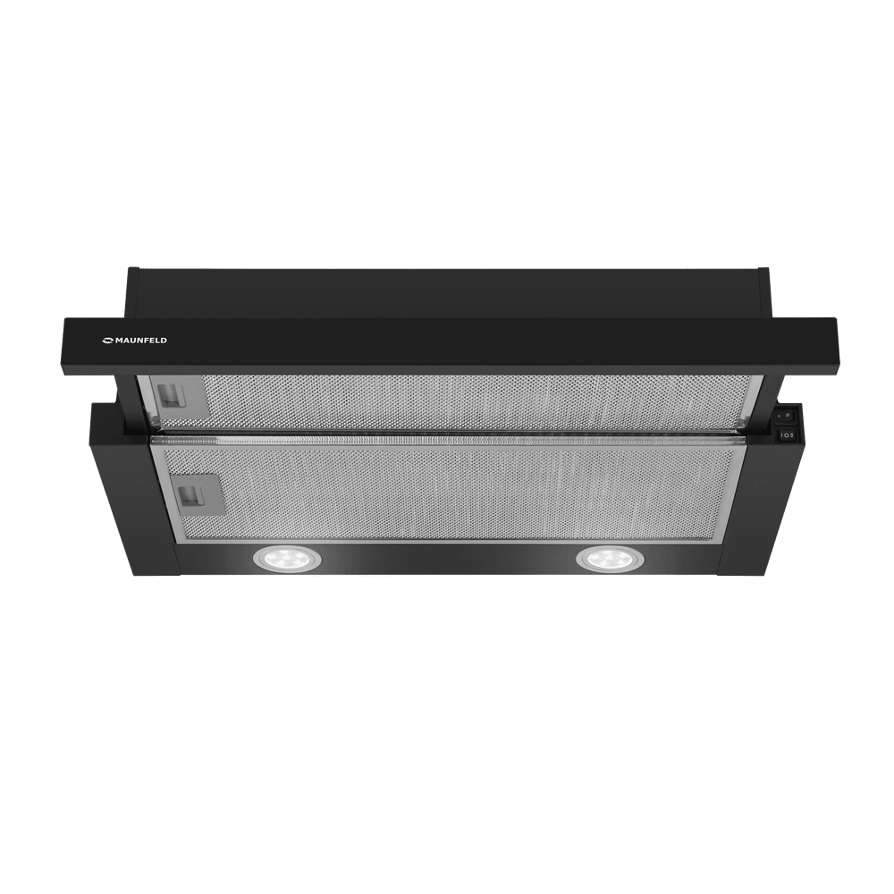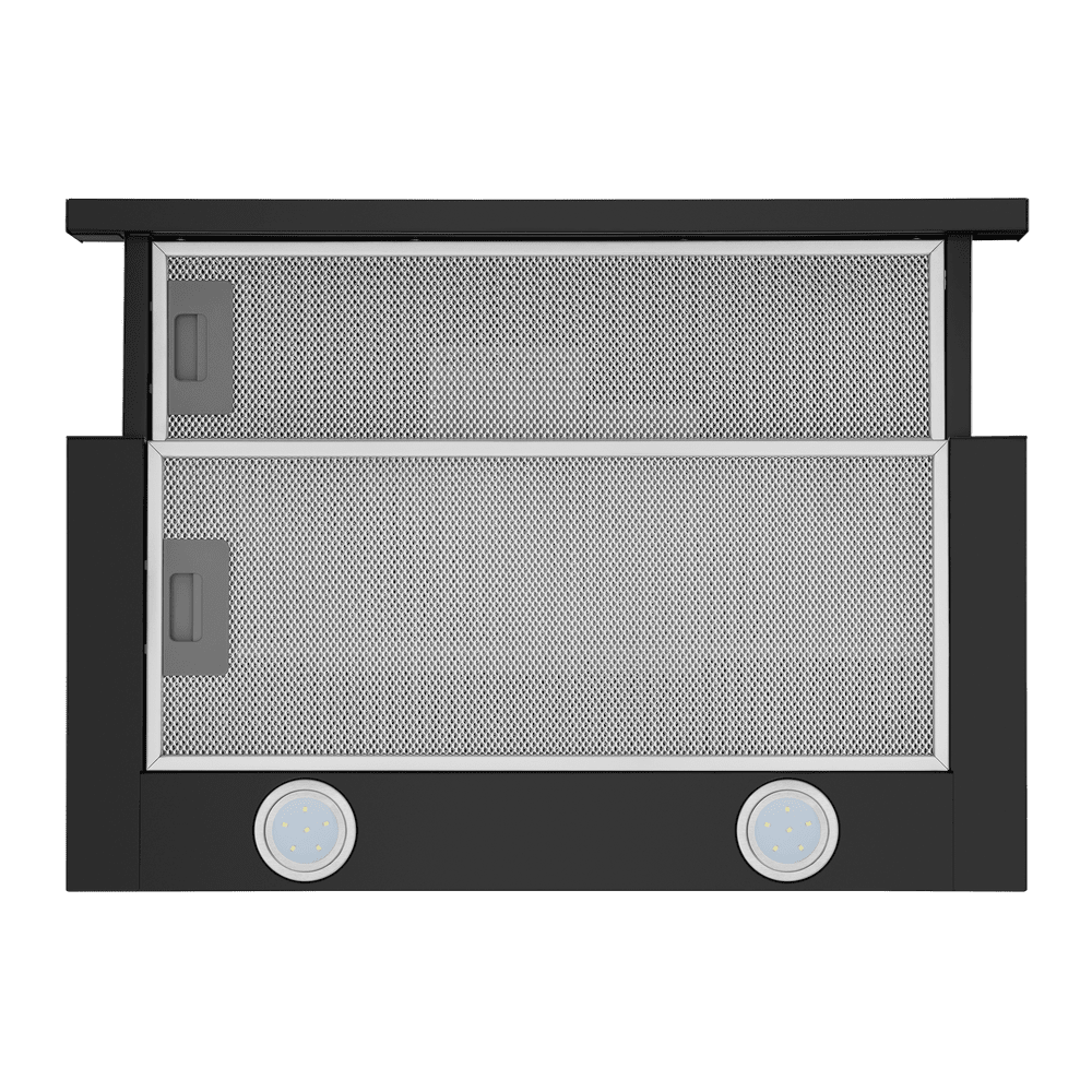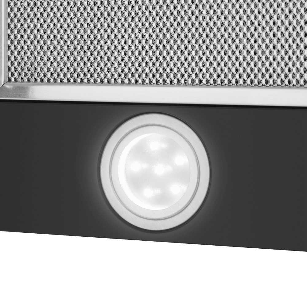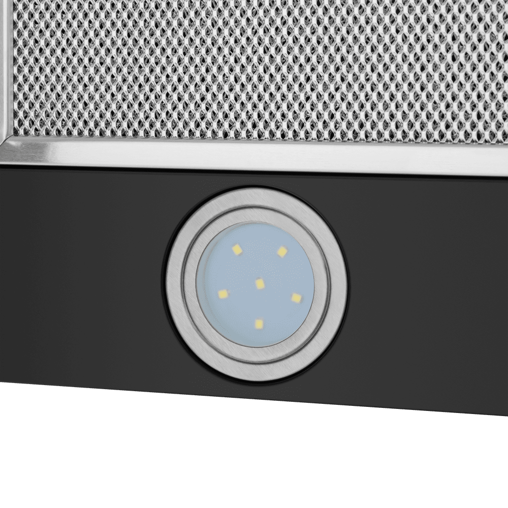 Корпус сделан из нержавеющей стали с качественным покрытием. Фасад выдвижной панели из закалённого стекла выполнен в цвет корпуса. Два многослойных жироулавливающих алюминиевых фильтра легко вынуть из вытяжки и помыть при необходимости.