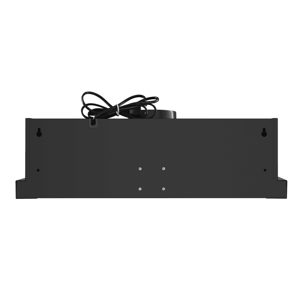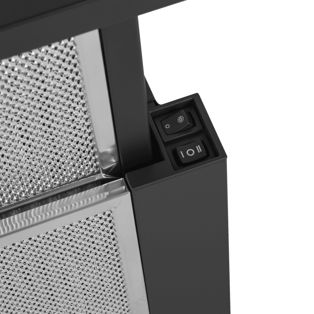 Управление вытяжкой осуществляется двумя клавишными переключателями, скрытых в торце фасадной панели. Можно выбрать одну из 2 скоростей вентилятора и включить освещение (светодиодную лампу на 2 Вт).