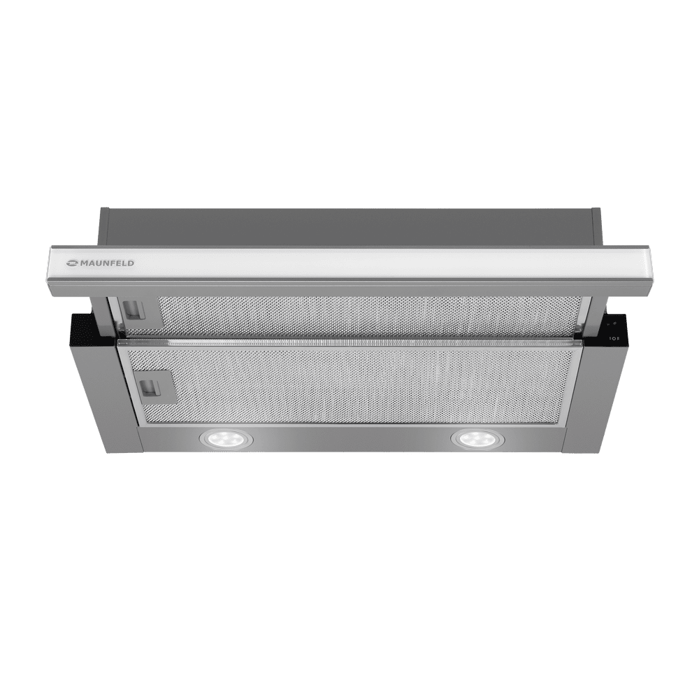 Чтобы включить прибор, достаточно потянуть на себя выдвижную панель. Вытяжка работает очень тихо, даже при использовании высокой скорости.