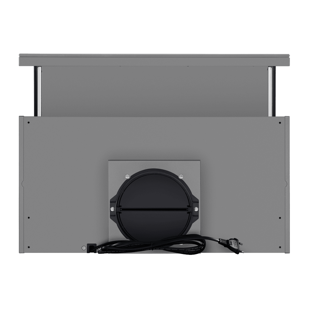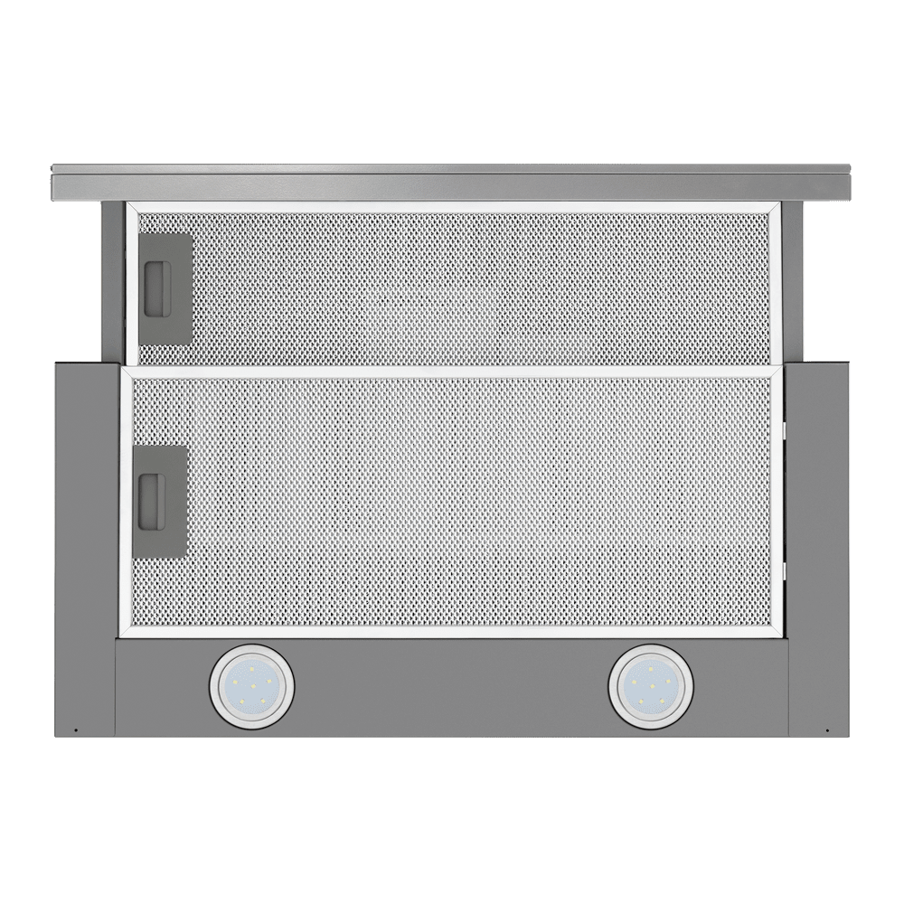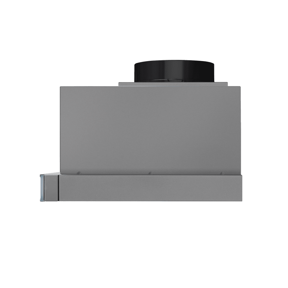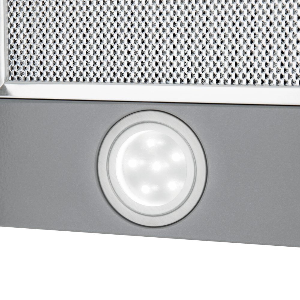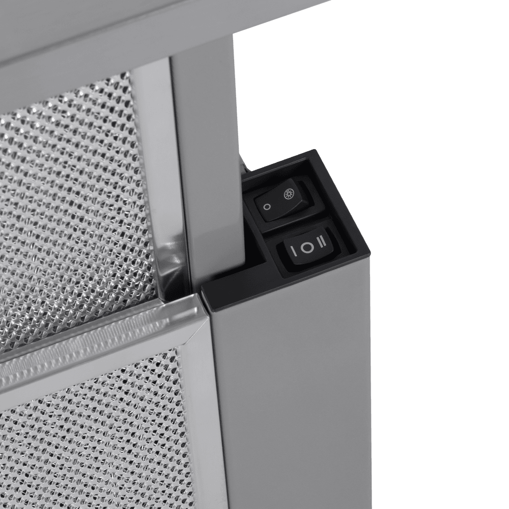 - Когда вытяжка работает, телескопический козырёк выдвигается, увеличивая площадь всасывания и обеспечивая более эффективное улавливание испарений и загрязнений