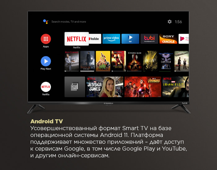 Телевизор MLT43FSD02 с диагональю 43 дюйма на платформе Android 11. Широкоформатный экран 16:9 с разрешением Full HD и технологией Dolby Digital.