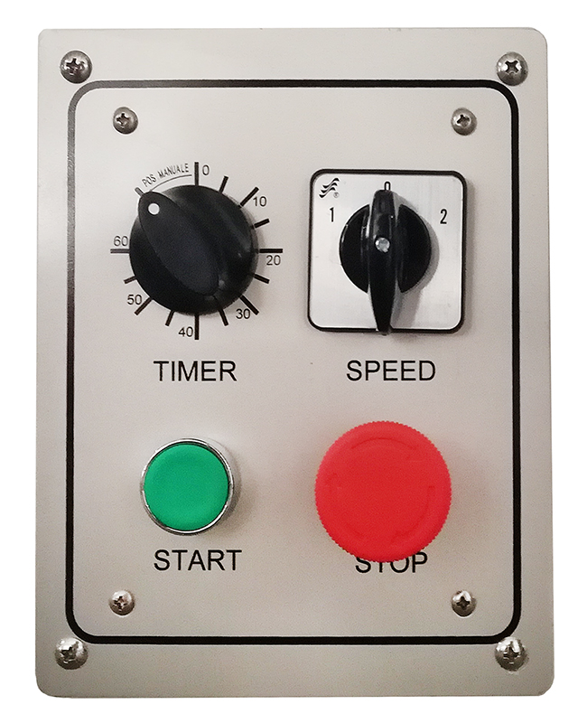 Панель управления аналоговая: переключатель скоростей, кнопка пуска и кнопка аварийной остановки, таймер.