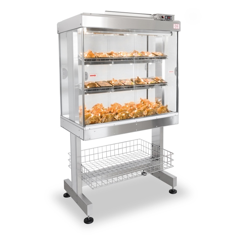 Тепловая витрина самообслуживания с системой непрямой вентиляции пищевых продуктов и системой автоматического закрывания стеклянных дверей.